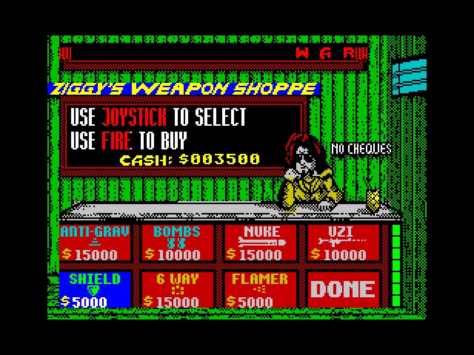 As well as the flamethrower from the loading screen, Ziggy’s psychedelic weaponry emporium offers you homing missiles, anti-gravity flight without using up your boost, shields, uzis, bombs and a nuke to obliterate everything on the screen; possibly overkill, especially at the crazy prices of even the most basic of these upgrades, which mean you won’t be experiencing many of them until you’ve been around enough times for second and third visits! It seemed like you were getting the bonus stage and the shop every third level, each representing a different geographic location, of which there are 31 across the nine missions.