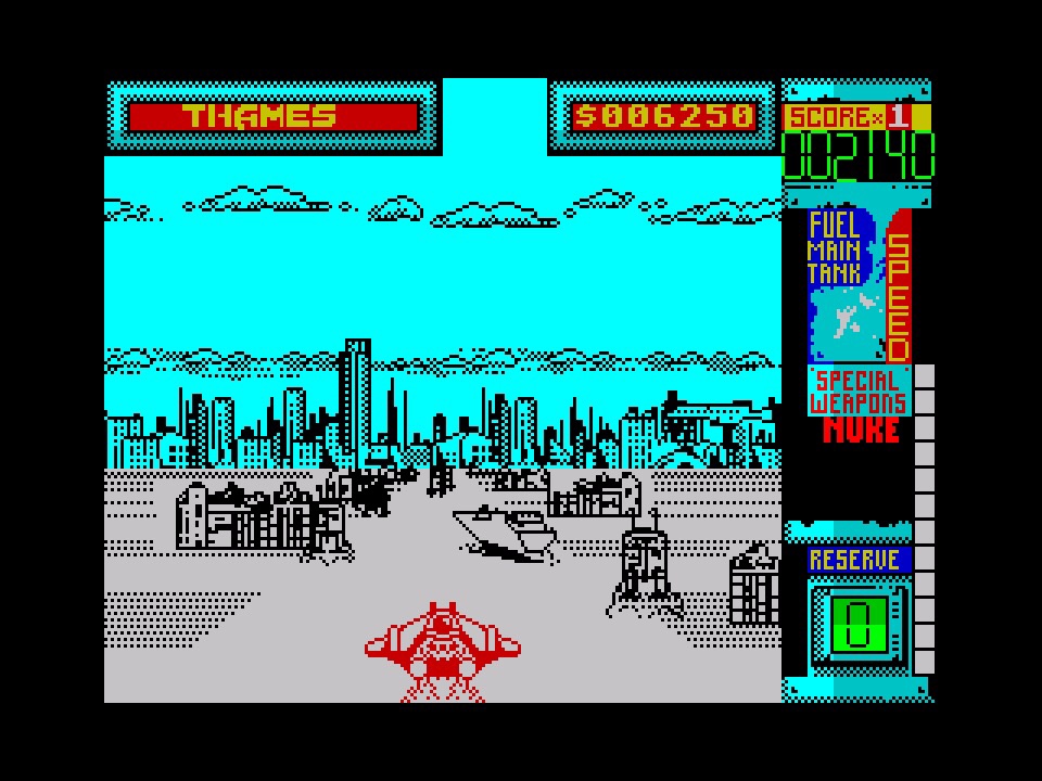I think there was a sit-down version of the arcade game, but we had a cool mini-upright cabinet with a flight controller and speakers that made the top section look like a boombox, and that would make an appearance, together with some nice arcade screenshots, on the back of the Spectrum cassette box when it was released by Domark in 1991! I’m still convinced there’s more to this than the laziness that might meet the eye… The lazy eye? Anyway, the full-page advert that appeared in Computer & Video Games magazine around June 1991 did the same, but unusually there wasn’t a mention of any of the formats it was being released on, but a preview in that mag did confirm all the usual 8- and 16-bit suspects. The following month it got less than average reviews in there on Atari ST and Amiga, and a news flash somewhere else confirmed a Spectrum version was coming soon, although the Spectrum magazines like Crash and Your Sinclair seem to have got their hands on it around the same time. Apart from Sinclair User’s 79%, the rest of the reviews came in pretty average on Spectrum too, but we all know that your own opinion is the only one that counts, so let’s dive in!