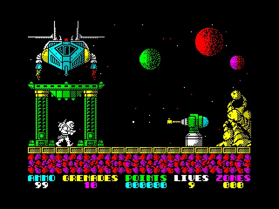 Everywhere you look is just the very best of what the Spectrum is capable of showing you, lit by a simple starfield with occasional boldy coloured planets appearing from the black abyss, but you’ll barely notice those for all of the even more boldly coloured action going on in the foreground. There’s colour everywhere! The stoney ground, the metallic structures, the aliens, their weapons, the… In fact, everything except your chunky white character sprite (no doubt to avoid the most colour clash known to man) is a mass of the very best of the Spectrum’s rainbow! You occasionally notice some masking around sprites to avoid colour clash, for example as an alien passes behind a platform, but it’s barely there. And when you throw in the flashing lights on the teleporters or the laser barriers, the whole thing is like some vast 8-bit space disco!