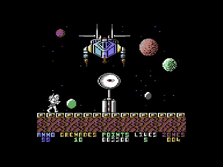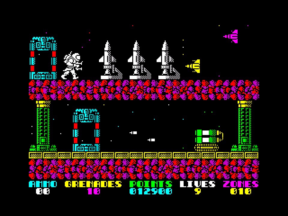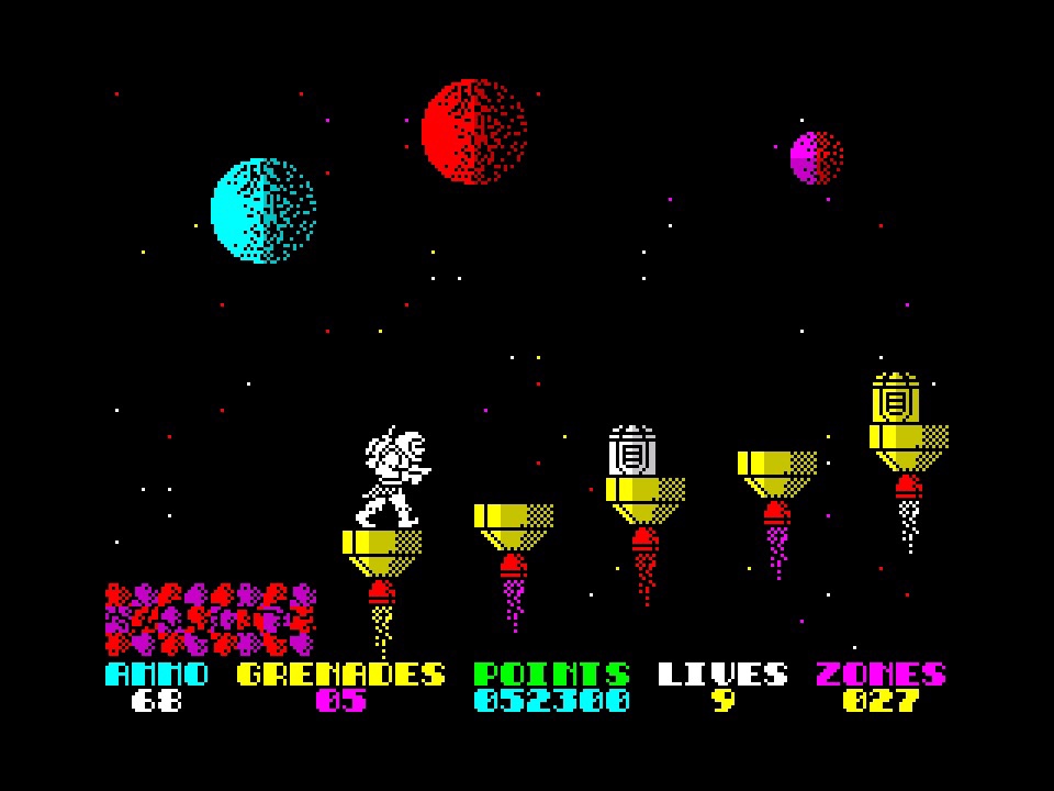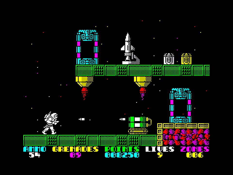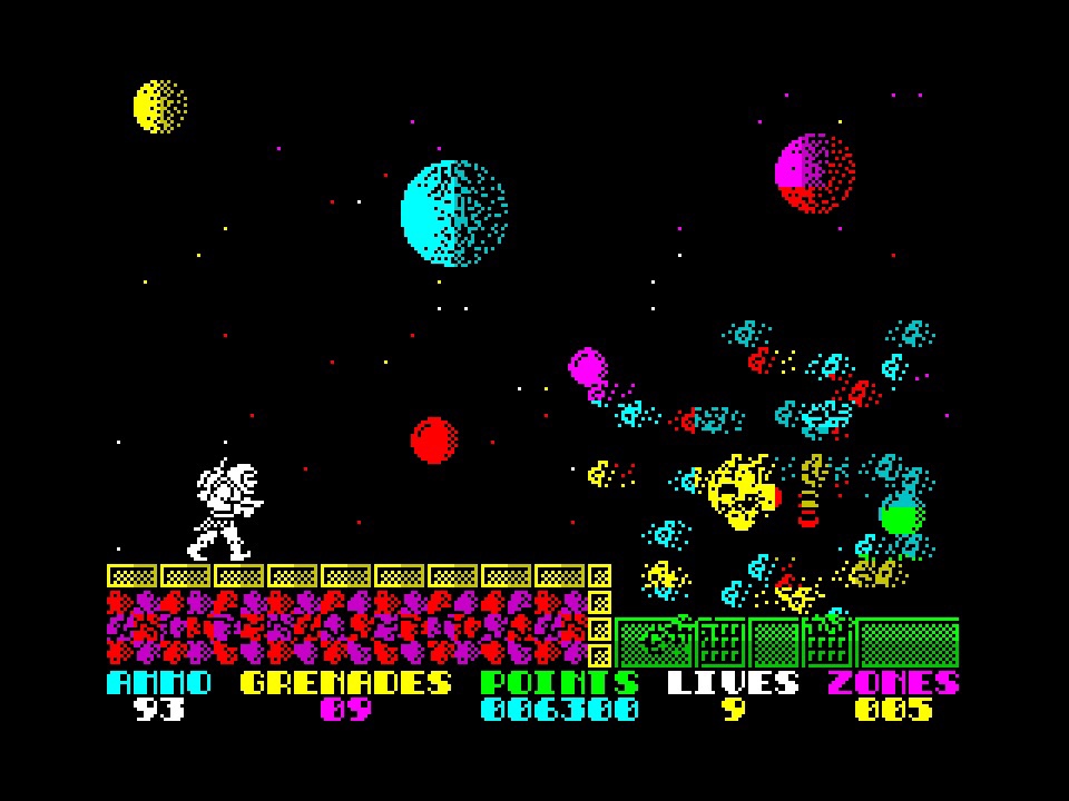 For all of those good looks though, I never actually saw a great deal of Exolon first time around. I picked it up a bit after launch, probably when it went on sale, and yes, I was, no doubt, blown away by it, but there’s only so blown away you can be by the first few screens! It’s hard, you see. And at the age of fifteen, I wasn’t the best at playing games (except IK+ and Match Day), mainly because I wasn’t the most patient, and certainly wasn’t interested in learning enemy attack patterns – why I still stink at stuff like R-Type! As my interest fairly quickly waned, I enlisted the help of ZORBA and must have got about eighty screens in. Now, I might have had infinite lives, but I was still rubbish and impatient, and it starts getting really hard before long, so when it glitched out after hours of slog despite the cheating, I was done. And anyway, I’d now seen most of what it had to offer, and I also knew I was never going to be good enough to do it without cheating, so that was that – beaten by a bug that didn’t care for cheats… It turns out that this is a known bug involving jumping off of certain high platforms that can cause a crash regardless, which would really suck if you hadn’t cheated to get that far!