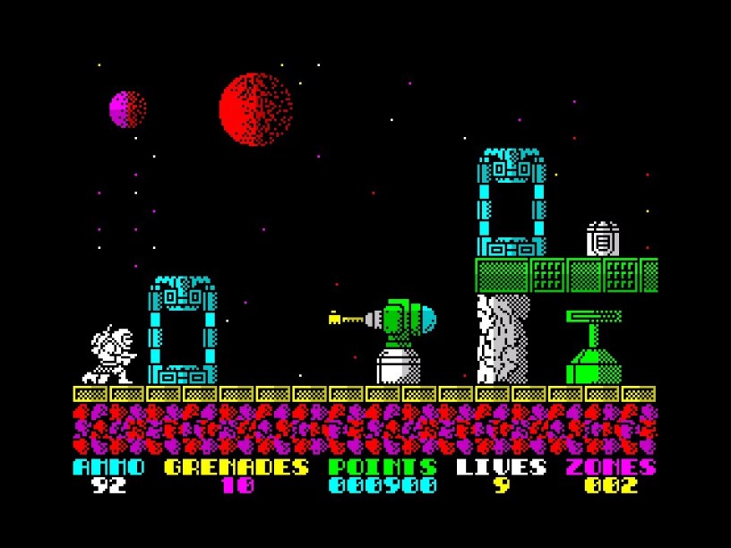 For all of those good looks though, I never actually saw a great deal of Exolon first time around. I picked it up a bit after launch, probably when it went on sale, and yes, I was, no doubt, blown away by it, but there’s only so blown away you can be by the first few screens! It’s hard, you see. And at the age of fifteen, I wasn’t the best at playing games (except IK+ and Match Day), mainly because I wasn’t the most patient, and certainly wasn’t interested in learning enemy attack patterns – why I still stink at stuff like R-Type! As my interest fairly quickly waned, I enlisted the help of ZORBA and must have got about eighty screens in. Now, I might have had infinite lives, but I was still rubbish and impatient, and it starts getting really hard before long, so when it glitched out after hours of slog despite the cheating, I was done. And anyway, I’d now seen most of what it had to offer, and I also knew I was never going to be good enough to do it without cheating, so that was that – beaten by a bug that didn’t care for cheats… It turns out that this is a known bug involving jumping off of certain high platforms that can cause a crash regardless, which would really suck if you hadn’t cheated to get that far!