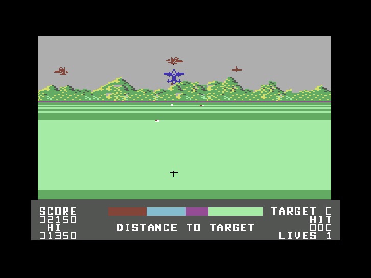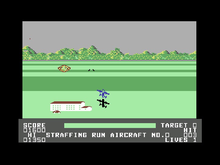 The idea is that you’re on a mission to take out enough ground-based defences, like tanks and radar stations, so you can then have a crack at your main target. You’re going to do this by swooping down low and strafing everything in sight, and once you’ve shot enough of one wave you’ll move on to the next. All the while, you’ll also have to deal with enemy aircraft and avoid flak, tank fire and so on all over the rest of the screen. Progress towards your target is shown by a colourful (if not exactly intuitive) gauge at the bottom, but effectively you’re making your way through four types of ground defences before destroying your main target building, where you’ll get one strafing run at it for each of your lives left. Do enough damage and you’ll be rewarded with big points and a bonus life for your next target, otherwise you’re starting from scratch through all those ground-based defences again for another attempt at this one.