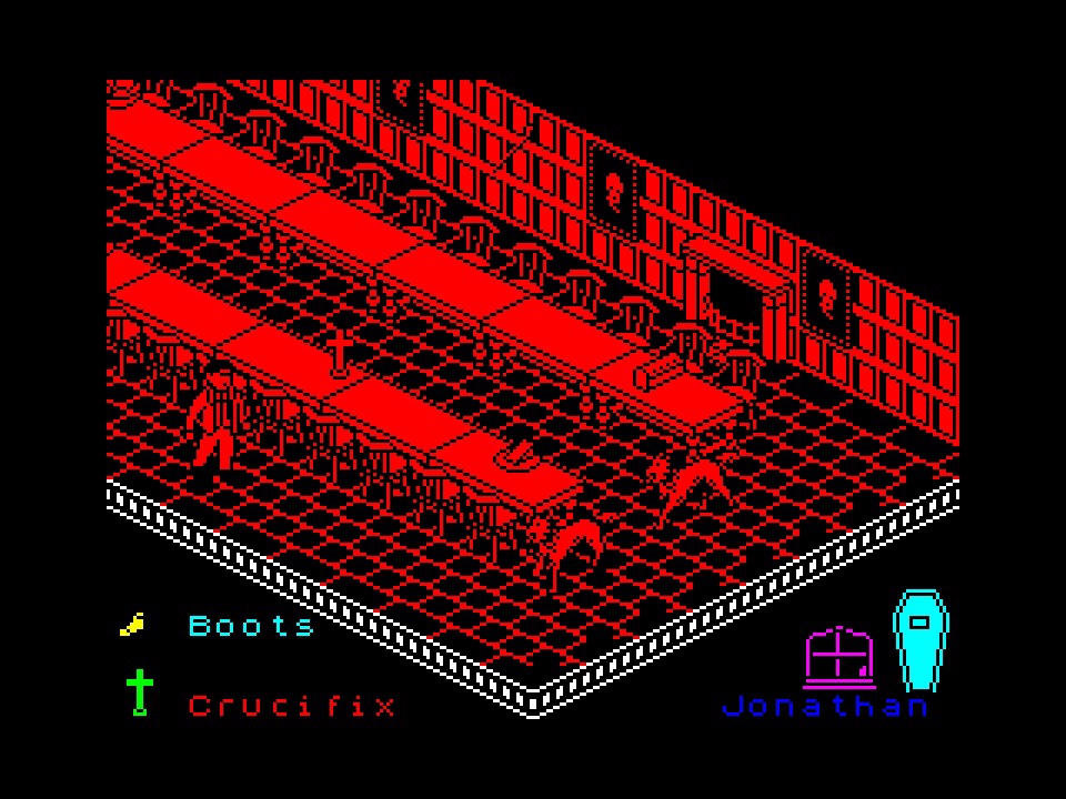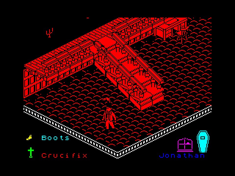 I was about to say that I’ve never really got on with many isometric games, but thinking about it, I’ve never really gone out of my way to play that many. I have played a bit of Knight Lore, but was never really fussed by it, and I’d still like to try Batman, but not enough to have ever spent a fraction of a second over several decades downloading a ROM! Similar for Head Over Heels, Hydrofool and The Great Escape. Never fancied the dinosaur one or Movie or Alien 8 either. Gunfright and this are about as far as we’ve got! Given my love of Dracula in his many forms though, and Stephanie Beacham and Caroline Munro circa 1972, and just wandering around one of the best video game gothic castles we’d get until Castlevania came along, that’s just about far enough though!