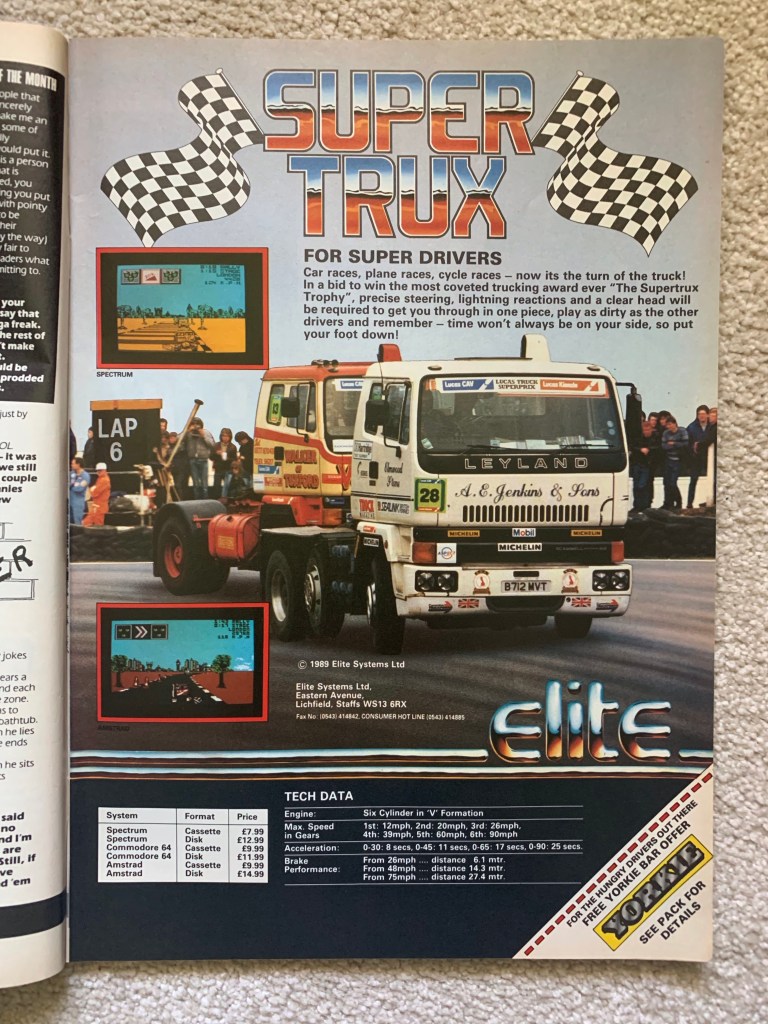 I’m not sure there was much else in the way of trucking on there until Supertrux (aka Elite Supertrux) came along, but by then we were slap-bang in the middle of prime time Spectrum racing. And unlike its nearest 8-bit neighbour, we’re talking some classics too, so even if you are into racing at that point I reckon Supertrux is going to have to be pretty special to get your attention! We’ve already mentioned that incredible conversion of Enduro Racer, with some of the best graphics ever seen on the system, and I don’t care what anyone says today, they loved that version of Out Run at the time! Now we’re also talking Buggy Boy, Roadblasters, Super Hang-On, Nigel Mansell’s Grand Prix, Overlander and, er, 4×4 Offroad Racing, and then Powerdrift, Continental Circus, Chase H.Q. and the mighty WEC Le Mans are right around the corner! Tough old ask even with that magical Elite logo and free Yorkie bar offer on the advert!