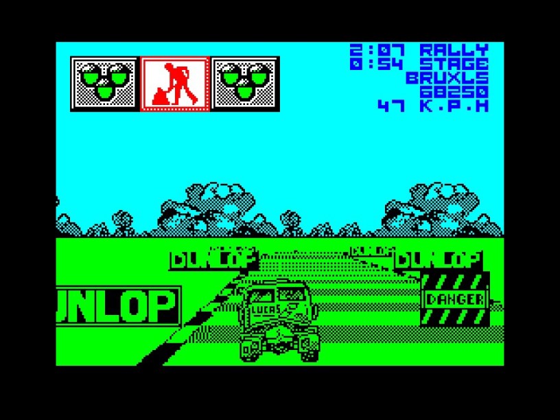 We’re kind of on our way now, but there’s one final note at the bottom of the instructions that’s ringing alarm bells… “Roadworks and corners are indicated on the status bar before you reach them.” Bit strange, and reminds me of another Spectrum game, Slaine, and how it’s instructions say that you might find its Reflex control system confusing at first, before failing to explain it! A kind of admission of guilt added after the fact, and I wonder if we’re looking at something similar here? Let’s hit fire to go and find out!