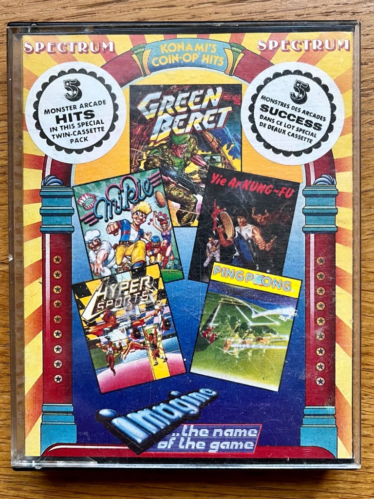 Another one is, obviously, the games, and of the five games included here, two of them were main draws for my brother and me – we’d drooled over our arcade favourite Track & Field’s sequel, Hyper Sports, since the arcade game (along with and Paperboy and 720O) had been used on the BBC kid’s quiz show, First Class, around the same time; and I’m not sure where we’d come across brutal run ‘n gun (or stab) Green Beret – probably magazine reviews – but we’re in peak Rambo and Commando season, so we were all over that too! As much as I was a fan of Shao-Lin’s Road in the arcade by this point (with the fantastic Spectrum conversion following soon after), its “predecessor” if you believe the marketing, Yie Ar Kung-Fu, had never appealed enough for me to spend money on it, but I was more than happy to see it on there too, although it would always be the game I played least! Then there were a couple of outliers that I really didn’t know – Mikie and Ping Pong.
