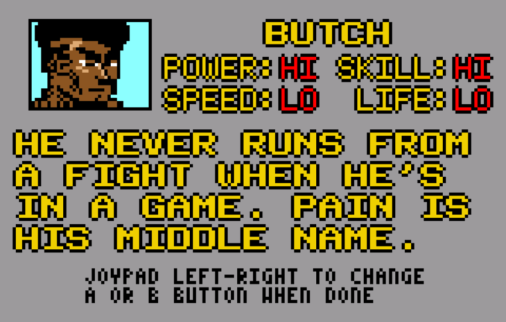 You’ve got a choice of characters at the start of each game, with each one accommodating different play styles through their power, skill, speed and life stats, each of which are high, low or okay. First up is Simon, who we’re told is a real nerd that prefers homework to basketball, but he’s quick! Slash is a punk who isn’t called Slash for nothing, and has a decent life bar. Then there’s Biff, Slam, Vinnie and Busterl each offering different pros and cons, or you could just pick Dude who’d rather be surfing and is average across the board, but probably better than average across the surf board! None of it seems to make that much difference, and you’re just as well going with your preferred stereotype, or you could enter MJ23 in that password screen and you’ll get a secret character with Michael Jordan’s heady attributes!