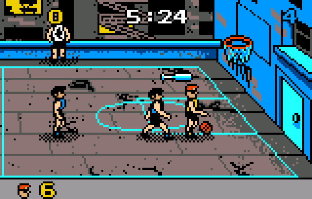 The whole thing might be no-holds barred, but there is a referee who’ll make his way onto the court from time to time to join in the fighting as he sees fit, and also watch out for gang members looking on too who’ll either be on the court whacking you two at a time or lobbing a knife in your direction from the side, which can do you serious damage! When you or an opponent loses all of your health, you’ll go down unconscious, becoming another obstacle on the court. You can mash the buttons to recover a bit faster, and you’ll want to do that as soon as possible if its you on the floor because while you’re down it becomes a scoring free-for-all! For a game that’s so simple, there’s loads of ways to approach it. You could spend your time beating down your opponent then going for loads of points once he’s out cold, but while you’re doing that his teammate will probably be scoring points down the other end of the court, though as long as you’re conscious a score will result in a ball change, so you’ll reset under your basket. When you’re in a game with a teammate rather than solo, passing becomes not just a strategic option but also a necessary one because if you get him mad he’ll start fighting with you too! In parallel you need to be thinking risk-reward when there’s the option of grabbing a power-up or weapon rather than the loose ball, and all the time you’re watching the clock and weighing-up where the points you need to get or defend are going to be best won.