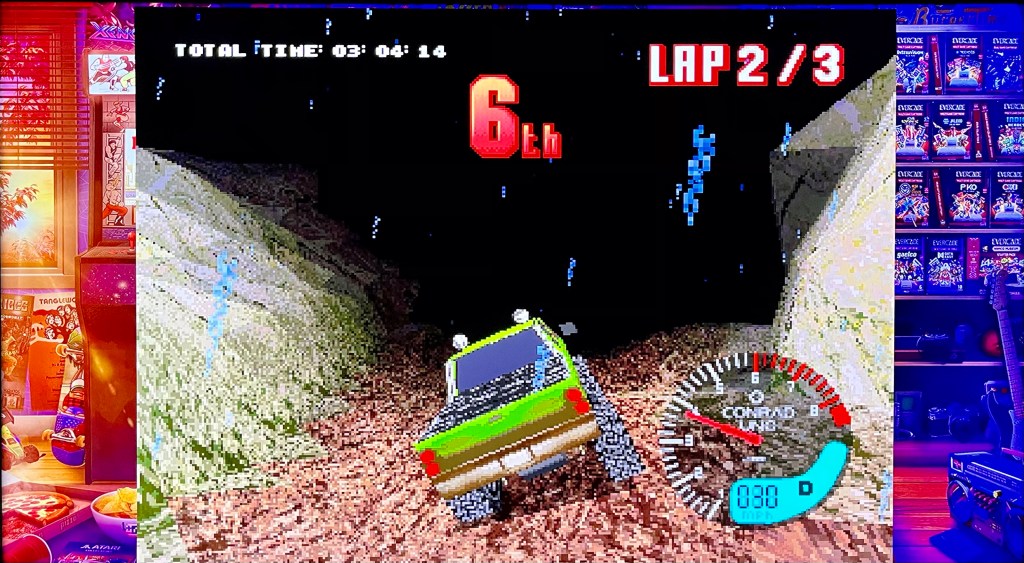 Another PlayStation game next, and 1996 3D off-road racer Hardcore 4×4. I didn’t own this one, but I do remember it being the one that clinched the deal when I first watched Evercade’s trailer for this compilation! Again, like most games of this ilk, it might be a little grating for some modern eyes, but those are not the eyes that this is here for! It’s fast and loose all over though, including the gameplay, to the point that a couple of laps into my first game even this retro apologist was really forcing myself to keep playing, but then the controls clicked – literally as I crossed the lap three checkpoint – and from there it turned into a surprisingly tactical racer. You can pretty much drive wherever you like, and you’ll quickly be weighing up risky off-track racing lines or anticipating the bounce as you hit a hill a bit faster than you know you should for an unorthodox overtake! There’s loads of vehicles, surfaces, track types and weather conditions, and three race modes including single race, time trial and full-blown championship, so loads to keep you occupied too. And it’s got a cool rock soundtrack! Look past the creaking graphics and this one is a highlight here.