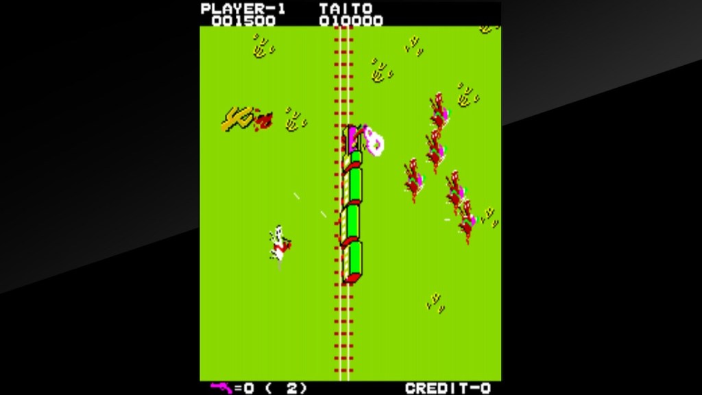 Wild Western. I could start this paragraph in the same way as the last, but unfortunately with Wild Western the same positive conclusion isn’t happening regardless of how much effort I put in! It’s 1982, and you’re a sheriff on horseback shooting at bandits trying to hijack the train trundling up the middle of the screen. Keep them at bay for long enough and it will arrive at the station and you get to do it all over again. I never saw this in any arcade, but I think it was some kind of early twin-stick shooter, where, rather than what would become the traditional second stick, I also think it used some kind of rotary fire button. Whatever it was and as ground-breaking as it might have been at the time though, it simply doesn’t translate to the default Switch controls! Aside from your horse moving more like a space ship than a horse on the left side of the controller, they have you trying to set the fire direction on the right analog stick and then shoot with the nearby B button using the same thumb, and in the midst of a firefight that stinks! The game knows it too, because before you start it suggests you might want to try the “simple” control scheme where you shoot in the direction you’re heading, but it’s not much better. In fact, the only way you can play this at all is to reassign buttons in the options menu and use a shoulder button to fire, which, incidentally, is how the PS2 Taito Legends version was set up from the outset. It’s still not much fun though, and that’s further compounded by a grating soundtrack, but in its defence there are some neat ideas, like being able to jump onto the train to get at any bandits that make it that far, then jumping back off when your horse gets close enough. I quite like the primitive Ikari Warriors (which also gets twin-stick plus fire right first time on Switch!) vibe to the game’s Wild West setting too – just not enough to ever really want to load it up again though!