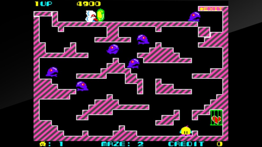 Chack’n Pop. This one’s going to seem familiar to anyone pining for the inclusion of Bubble Bobble here! It’s a 1983 spiritual predecessor and a bit more besides, as your little yellow blob platforms his way to free caged hearts that will open up the level’s exit while avoiding monsters hatching from eggs, or just lobbing bombs to destroy them, though that’s always a risky business when their explosions spread Bomberman-style and can easily take you out too! That risk is then compounded by some very awkward movement mechanics, where your blob is stretching to reach a flat expanse above him rather than jumping, and no matter how much I played that never got intuitive, but did always manage to suck most of the fun out of the experience as soon as you’ve got a monster on your tail. Thank goodness they sorted that out in time for Bubble Bobble! It’s interesting to see the evolution of such a familiar visual and audio style, and as such a big fan of Bubble Bobble I spent way longer trying to like this than it probably deserved. Another case of nearly really like it though.