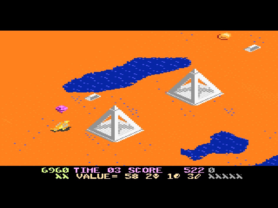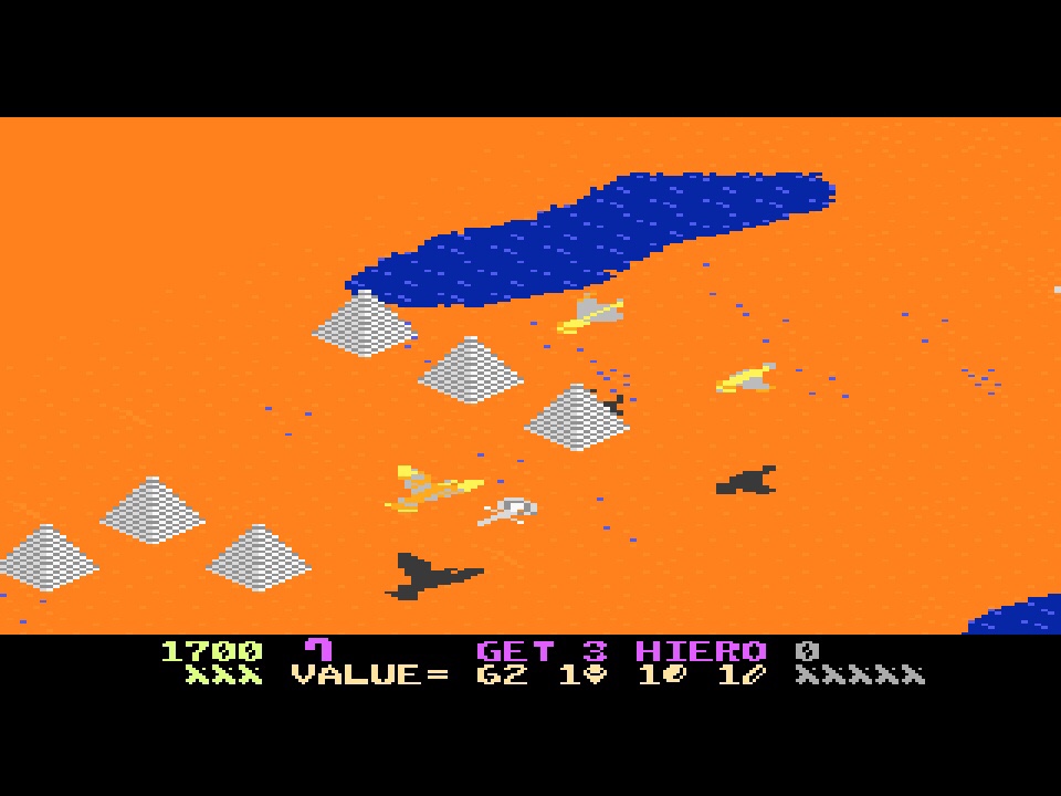 Much like its generic arcade sound effects, as far as gameplay goes though, I think it would probably have felt like as much of an Egyptian relic in 1984 as it would have in 1987. We’d had Zaxxon since 1981 – a lifetime ago in gaming terms at the time – and between 1981 and 1985 that had been ported absolutely everywhere; even the Dragon 32 had a version! And Desert Falcon plays pretty much like a less frantic Zaxxon, which is partially down to its setting, and partially (and intentionally) down to its treasure hunting on the ground, which is its own thing. And while you’re down there, it’s not just collecting treasure doing its own thing – there’s also the hieroglyph system! Hop over any three hieroglyphs (ankhs, eyes, feathers and so on) scattered in the sand and you’ll gain a superpower, which include a screen-clearing air-bomb, decoys, sphinx paralysis, invincibility and a really cool warp that flies you at light speed right into the next Howling Sphinx’s face! The trick is trying to work out which combination delivers which superpower, and that makes for some nice experimentation and also the occasional risk-taking when you see the one you need is buried exactly where you don’t want to go! All that said, my best run on Desert Falcon was the one where I decided to ignore everything on the ground and just play it like Zaxxon! I think if you’re serious about high scores that’s probably not the way to do it though, and I’d honestly recommend playing Zaxxon if that’s what you want! But while this might be a bit of a rip-off, and it’s definitely a bit of a relic as a result, that doesn’t mean it’s not fun, especially when you’ll take Ancient Egypt over outer space every time!