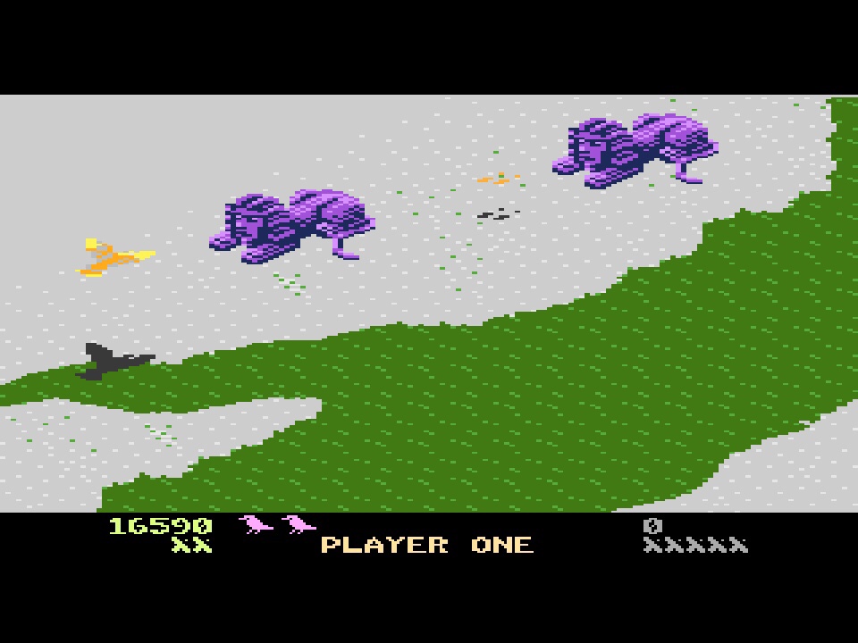 As I’ve still got the book to hand, let’s take a look at what programmer, Michael Feinstein (I assume of General Computer Corporation), had to tell us about the game… “Desert Falcon was one of the few original games we wrote, and the first original game designed specifically for the 7800. We wanted to make a game reminiscent of Zaxxon, the arcade classic, but with a new motif.” He then goes on to talk about one the first things that really struck me with Desert Falcon, and that’s the animation of the falcon itself – there’s loads of it! There’s taking off and flying, stalling and turning, diving and landing, and on the ground you’re either hopping or swimming, and, of course, there’s plenty of dying too! That was apparently the first part of the game they wrote, and they went to town on getting it all realistic and giving the falcon a personality; in fact, they spent so long on that bit that while the other twelve games in the very original Atari 7800 line-up were progressing towards being actual games, they could only show a “bird and dirt” on the screen. So that’s what it was then nicknamed in the development team!