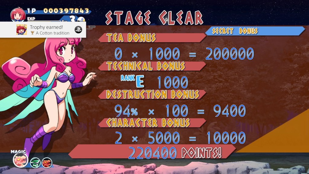 It’s perhaps because I’m a bit of a fan-boy that my first impressions of Cotton Fantasy were a bit on the lukewarm side. Firstly, there was no score attack or caravan mode in the main menu like we had in last year’s Cotton Reboot, just story mode and training mode, which lets you play stages you’ve already unlocked with various difficulty tweaks and modifiers available if you want them. Instead, the main source of longevity is to be found in the story mode, where, as well as three difficulty levels, you’ll get to choose from an initial line-up of six characters (plus more for finishing the game), and behind them is hidden away some enormous depth! We’ll come back to those in a second though… Choosing Cotton first, you get a quick overview of how to play, then we’re into the first of the most beautiful set of partially animated, classic Cotton anime cutscenes to date, spoken in Japanese with English subtitles, just how they should be! We then get a world map (which reminded me of Pac-Land’s!) and that will later act as stage select, and we’re off, and honestly it’s all a bit sterile, in a kind of modern-day Darius or that R-Type Dimensions way; that’s particularly true of the enemies too, which wouldn’t look out of place in a Kirby game on Nintendo Switch. Give it a minute though, and the sumptuous gothic colours we might expect from Cotton (as well as its trademark moon) start to emerge, and by stage two it’s even hinting at being absolutely glorious to look at… And I’m not just talking about Silk in the least amount of clothes in the highest resolution we’ve ever experienced between stages! Actually, what really turned things around for me – still on my very first go – was the familiar ping of a PlayStation trophy appearing at the end of the regular Cotton Tea-Time bonus round after beating the first boss, received for knowing that the biggest bonuses in Cotton are awarded for completely avoiding any bonus items altogether. I was really pleased with that bit of fan-service!