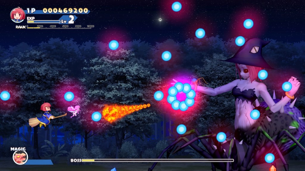 Visuals are a mixed bag. Earlier on I said things were a little sterile, and while the environments grew on me the further I got, the cannon-fodder enemies remained so, seemingly built for style over character, and that style is a bit too Disney-minimal for my taste. Bosses do their own thing, sometimes to the point of inconsistency, but they’re mostly big and impressive, and sometimes even hiding some of that character missing elsewhere in their minions! The backdrops to each level are varied, combining both memories of previous games as well as some neat new ideas, but work best when they’re acting as pure backdrop rather than part of the level. On the whole though, I can’t help wishing it all looked like last year’s Cotton Reboot, because that absolutely nailed the current-gen (ish!) take on the Castlevania-esque cartoon-gothic vision of the earlier Cotton games, where Fantasy doesn’t seem quite so comfortable with that level of decadence, and every time it goes there it checks itself and polishes everything clean again instead. When it’s at its best though, with a screen full of chaos in front of a sinister, living forest as a giant spider turns into a gothed-up sorceress, it’s the best!