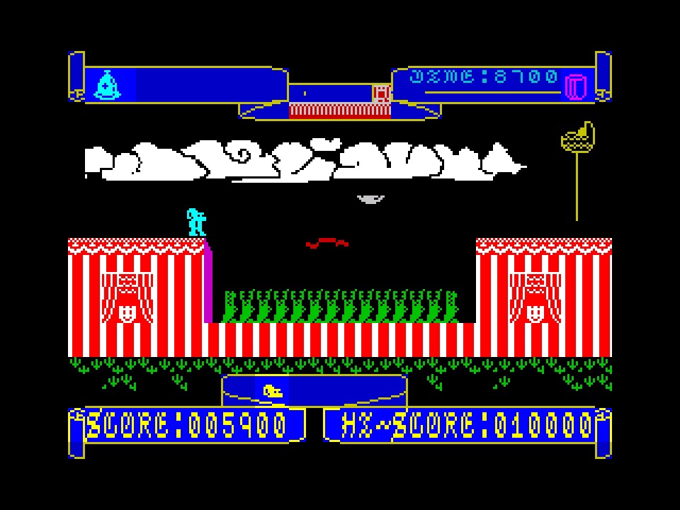 As soon as you load up the game, you’re hit by a well known piece of Egyptian music, although for the life of me I couldn’t think of the name so did a bit of research, and it turns out that the reason I couldn’t think of the name is that it has both loads of names and also none! Firstly, you know the song by the words… “All the girls in France do the hokey pokey dance, and the way they shake is enough to kill a snake.” Or there’s a completely different variation that you also know… “On the planet Mars all the women smoke cigars, and every puff they take is enough to kill a snake.” That had a school playground variation about the land of Mars where the women don’t where bras too! Anyway, now we’ve got the Eygptian melody (which it’s also known as), it goes by the name of the hookie-kookie dance or the hoochie-coochie dance, or The Streets of Cairo or Dance of the Midway or even Coochi-Coochi Polka! The thing is that no one really knows where it comes from; going all the way back to 1864, it appears in a trumpet piece called the Arabian Song, but then that can seemingly be traced back to Afro-European folk songs from centuries earlier. And I wasn’t expecting that lot from trying to describe a grating ten-second loop of vintage ZX Spectrum music!