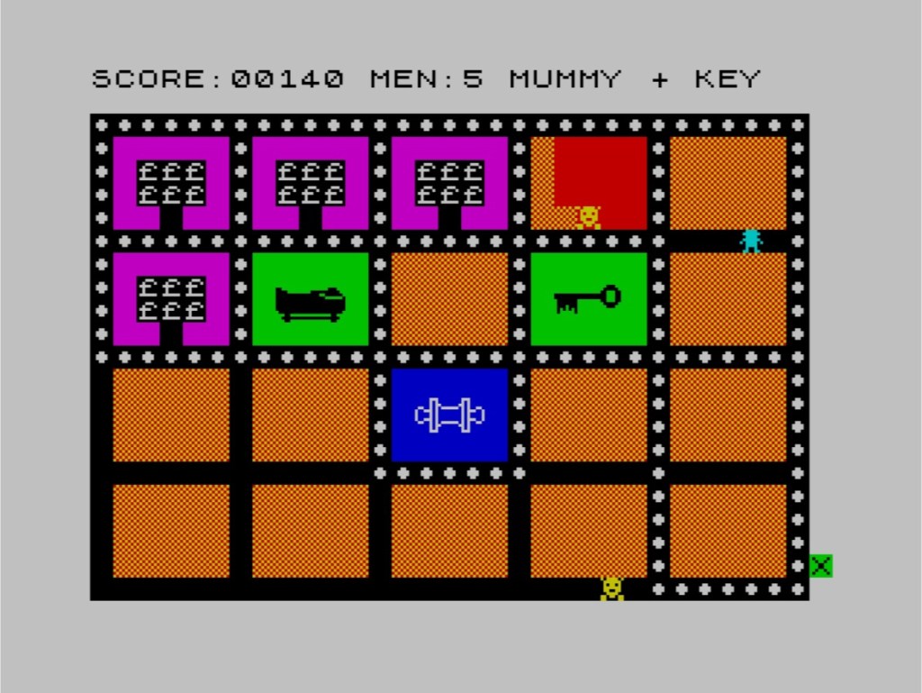 Once you’ve discovered the five mummies spread across the five levels of the tomb, you’ll get a press release from the British Museum saying it’s successfully plundered another tomb belonging to a foreign country, and also a reward for your efforts (an extra life as far as I’ve ever seen) before moving on to the next tomb, which is going to feature more cunning guardians, as well as any that survived the previous level, so make sure you use that scroll when you find it! Gameplay itself couldn’t be simpler, with just four directional keys moving you around each of the squares that make up the level, and once you’ve got all the way around one its contents will be revealed and automatically collected; another defensive tactic is taking shelter in any treasure houses you uncover if you’re in trouble with the guardians, and you’ll usually get a generous number of those per level too.