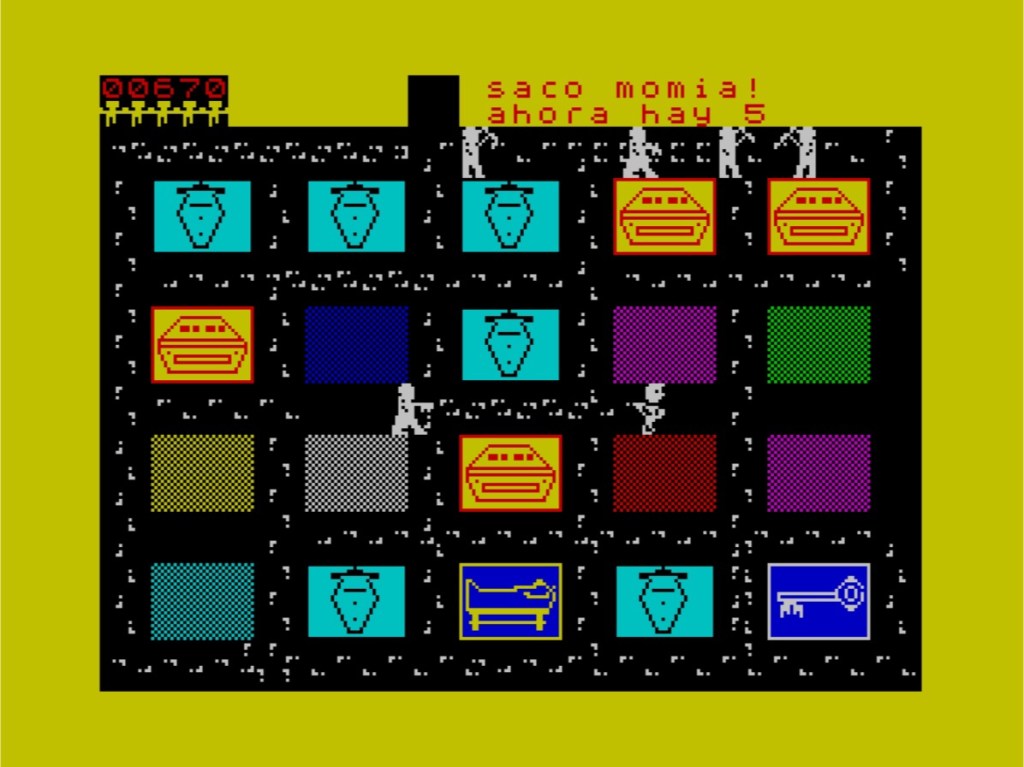 Gameplay like Oh Mummy’s has no need for trinkets and baubles, but if you’re desperate to have them dangling off it, there’s a 2021 homebrew reworking that has you covered there! All the smooth movement and cartoon animation you can shake a stick at, and there’s fancy footprints all over the place and it’s got actual mummies (I think) shambling around after you. The sound has all but gone though, the colours are more muted, and speaking of colours, where’s that cool orange? I thought all Spectrum homebrews had to have orange in them now, not least when they’re remakes of actual games that tried it originally! Speaking Spanish helps too, but none of this is really for me and I’m fine with the original.