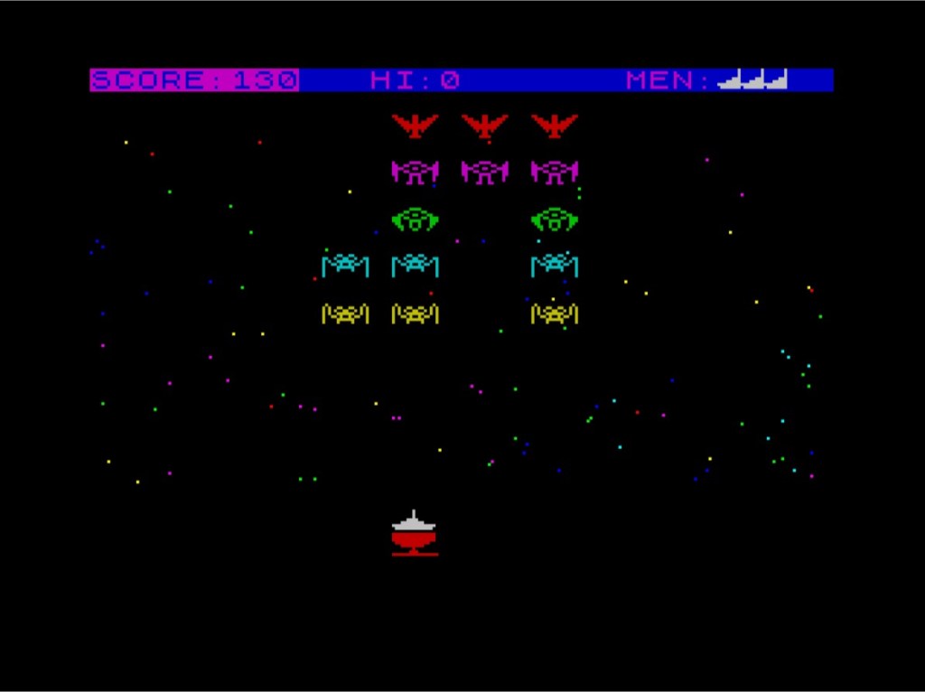 It’s at the top of the box, so we’ll have a look at Alien Destroyer next. There’s a nonsensical story about you being the last human left on the fortress planet of Roolfhtenin, tasked with the job of keeping the evil forces of Crabok at bay for as long as possible with your laser bases. About the only thing I appreciate about this Galaxians mess from 1984 is the honesty of the instruction booklet… “They have unlimited forces; all you can do is buy time.” That said, compared to the game it’s aping, there’s no threat whatsoever for a while! The first wave of invaders move left and right on the screen – and note I say “on the screen” rather than across it – waiting for you to either pick them off or drive them insane with the horrific sound effects coming out of your laser base! Eventually one of them will flicker downwards instead of across and maybe even get a shot away, but you’ll have just about cleared the rest by then. The action picks up a little bit as you move onwards, but the invaders still keep jumping left a bit then right a bit, never shooting at you except when one of them decides to make a break downwards, but even if it does hit you you’ll welcome death’s cold embrace by this point!