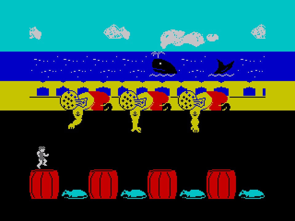 Two to go, and I’m going with Treasure Island next because not only did I not know it at the time, but I have absolutely no recollection of it now either! Also from 1984, this is based on the Robert Louis Stevenson classic, with you playing Jim Hawkins, making his way to Treasure Island then tackling murderous pirates as he explores 64 sections of the map to Ben Gunn’s cave and the treasures within. Before we go on, I always appreciate a game not only describing itself as “exciting” in its own instructions, but also telling you that the treasure map you’ll find therein is “attractive!” Unfortunately, I’m struggling to verify either though, not that either of the above is necessarily untrue (although I do have my suspicions), but I can’t even get to what those instructions also describe as the “main game” on Treasure Island to find out! The first screen has you avoiding Blind Pew who, in fact, appears to be the the outlines of three stereotypical elderly folk with walking sticks, to board the good ship Hispaniola. The problem is that the merest touch from any of them means instant death, and by “merest touch” I mean vaguely share the same quarter of the screen with any of them! By some miracle I did make it onto the gangplank a couple of times, where you now have to avoid capture by the mutinous crew, which translates to your tiny sprite jumping between barrels from one side of the screen to the other, avoiding the grabbing hands of some gargantuan pirates, but even Punchy wouldn’t attempt this brutality! This one really stinks, and as exciting as it might profess to get later, there is zero fun to be had beforehand! And, without doubt, this has the worst collision detection I’ve ever seen in a game, which is some accolade!