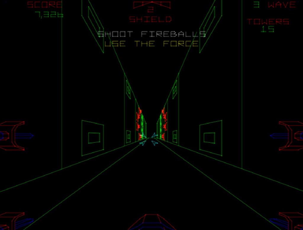 Back in the machine, once you’ve selected from easy, medium or hard difficulty, which effectively dictate where in the game you start, as well as the massive bonuses on offer for a successful run, you’re in Luke Skywalker view inside the X-wing and ready to take on phase one. Each run consists of three phases, culminating in blowing up the Death Star for that potential bonus then starting again. First you need to get there though, and with a burst of the Star Wars theme to inspire you on, you’re straight into a dogfight with Darth Vader and a bunch of TIE-fighters! The music is worth a mention here because throughout the game you might get a few seconds of that or the Imperial March or any other random bits of John Williams’ iconic soundtrack from out of nowhere, in full chiptune stereo, and each bit apparently no more than once every seven minutes! Alongside the music and the punchy laser fire and explosions, we’re also treated to a load of sampled speech, with inspiration from Obi-Wan Kenobi, congratulations from Han Solo, commentary from Darth Vader and Luke himself, either giving instructions to R2D2 or the classic “Red-Five, I’m going in” as you rid yourself of Empire fighters and survive enough of this initial onslaught to get drawn towards the Death Star as it looms out of the distance! This stage is time-based rather than having to take down any specific number of enemies or the big fireballs they shoot at you, and in fact you could just passively avoid everything if you really wanted to; actually, not shooting a TIE-fighter and letting it fly straight by you will give you my favourite bit of sampled sound in the game – that sinister roar that was based on the German Stuka bomber’s terror-siren, but was, in fact, the sound of an elephant combined with a car driving on a wet road! In reality there’s not really a huge amount to this bit, but that doesn’t take away from the thrill of multiple TIE-fighters all over you at once, and finally nailing one of them and seeing it explode into lots of bits of vector! And there’s always the rumour about if you shoot Darth Vader enough times you’ll get masses of shields to keep you occupied!