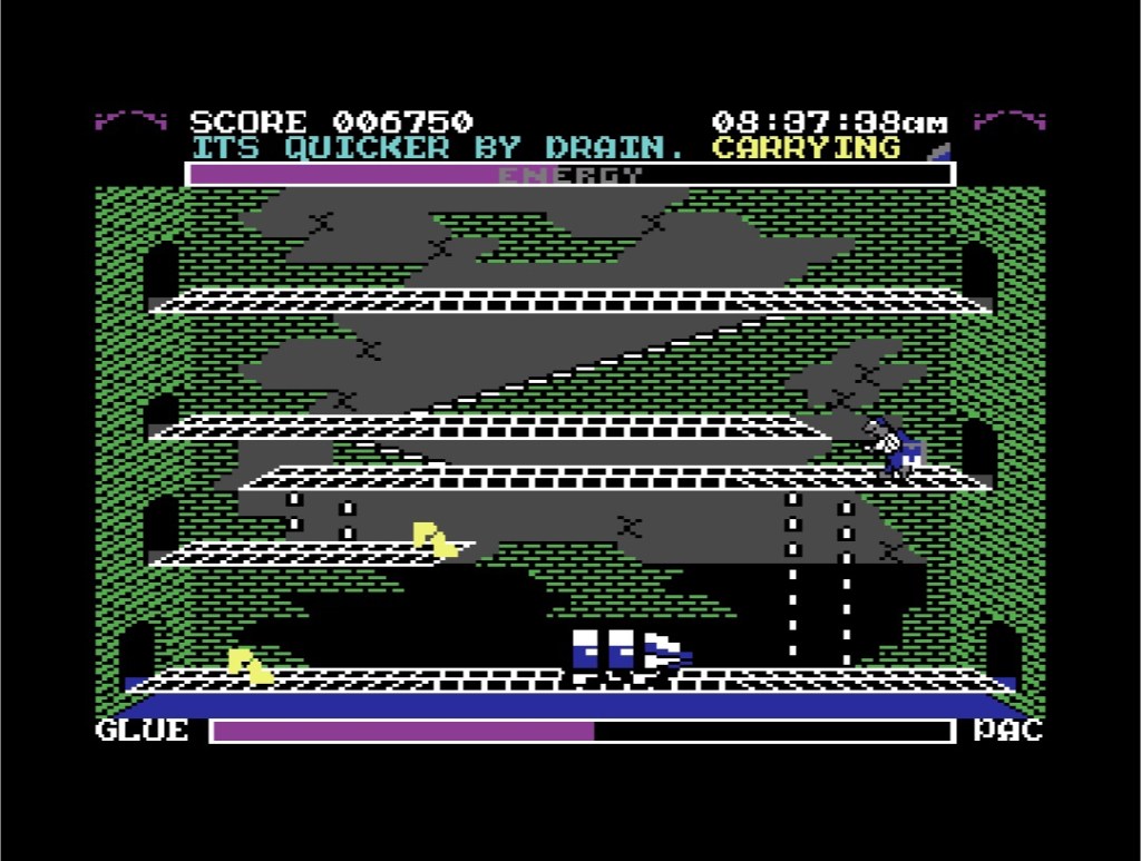 By the time you’ve got anywhere near picking up enough pieces of the door, you’re going to know exactly where you are and where you need to get to at any given time, and actually, you’ll probably be sick of the sight of it all by then too! Roland’s Rat Race is very C64 circa 1985, but I mean that in an endearing way. Yes, there’s plenty of its legendary rainbow of colours, and it’s got its fair share of overly-blocky sprites, but Roland himself is a joy! You really couldn’t ask for more authenticity, and the same goes for the detail in the crumbling brickwork and clever highlighting in the main pipes in the background too. There is only so much variety you can expect of a sewer system though, and in the end the biggest challenge to both navigation and your will to finish the game is everything looking virtually the same, even before you’ve been that way for the twentieth time! The slightly irrelevant background music doesn’t help either – it’s jolly enough, but really not enough for prolonged play; I do like the splat of the glue gun though!