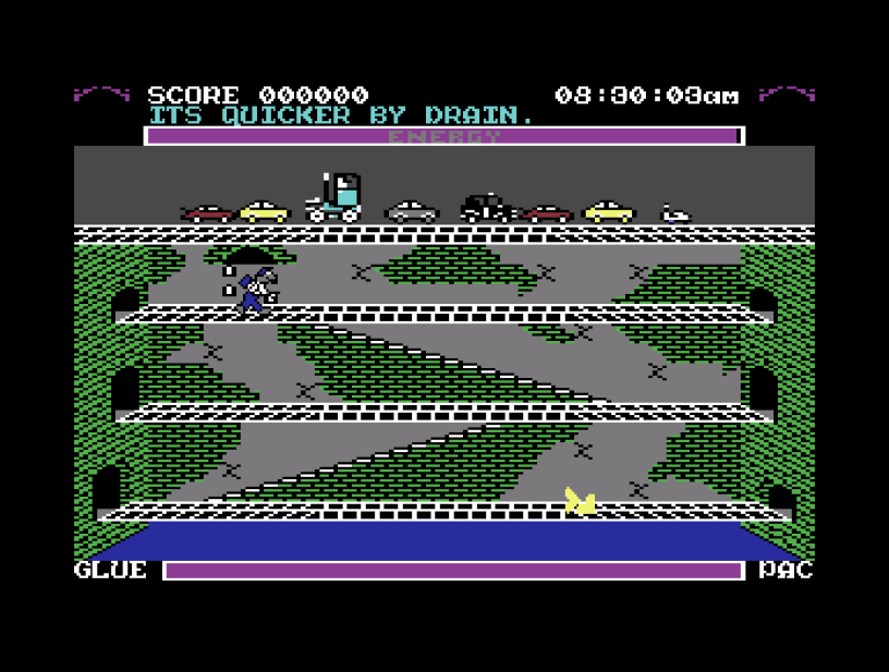 By the time you’ve got anywhere near picking up enough pieces of the door, you’re going to know exactly where you are and where you need to get to at any given time, and actually, you’ll probably be sick of the sight of it all by then too! Roland’s Rat Race is very C64 circa 1985, but I mean that in an endearing way. Yes, there’s plenty of its legendary rainbow of colours, and it’s got its fair share of overly-blocky sprites, but Roland himself is a joy! You really couldn’t ask for more authenticity, and the same goes for the detail in the crumbling brickwork and clever highlighting in the main pipes in the background too. There is only so much variety you can expect of a sewer system though, and in the end the biggest challenge to both navigation and your will to finish the game is everything looking virtually the same, even before you’ve been that way for the twentieth time! The slightly irrelevant background music doesn’t help either – it’s jolly enough, but really not enough for prolonged play; I do like the splat of the glue gun though!