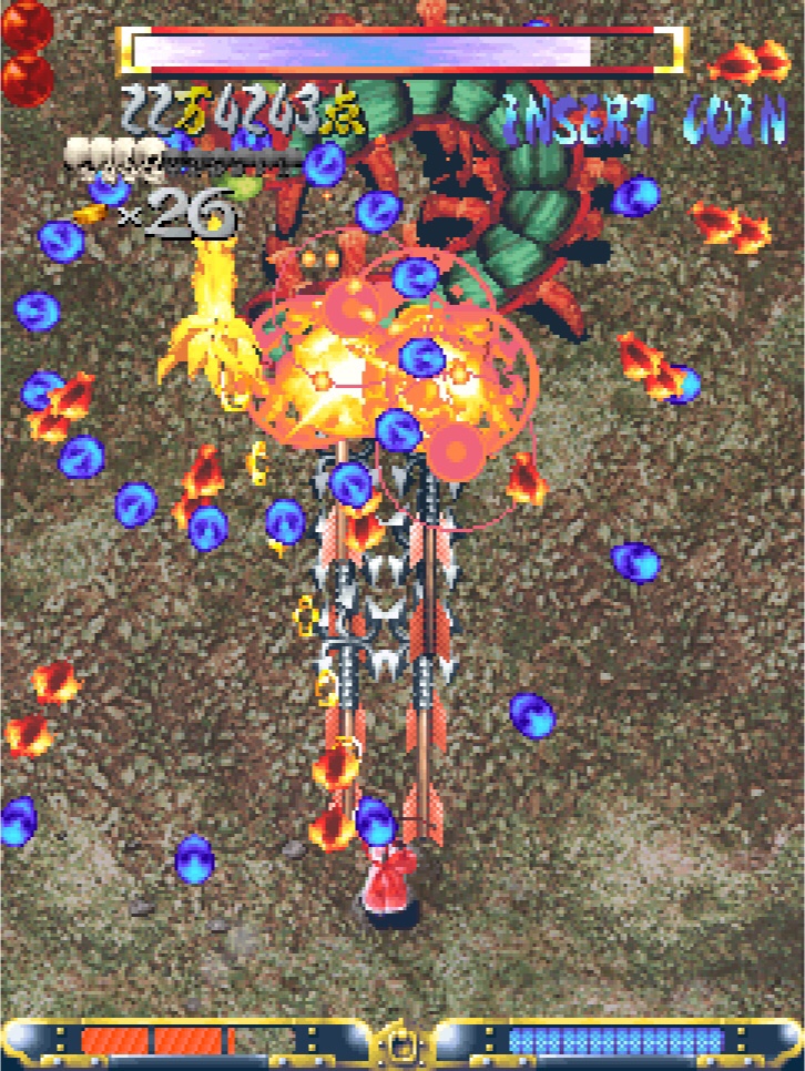 Cave’s 1999 vertical shoot ‘em up Guwange is unique in many ways, although it never stops feeling like a Cave shooter! It’s set in Feudal Japan, and you’re not only playing vertical, but also horizontal and diagonal as you’re led along the ground rather than through the sky, with three life bars and a supernatural power-up that you can independently control at the cost of restricting your own movement. Sounds weird, is weird, but it plays like a dream, and you’ll soon forget you’re totally grounded as you gracefully and impossibly sweep through walls of bullets. One of the most sinister game over screens you’ll ever see too!