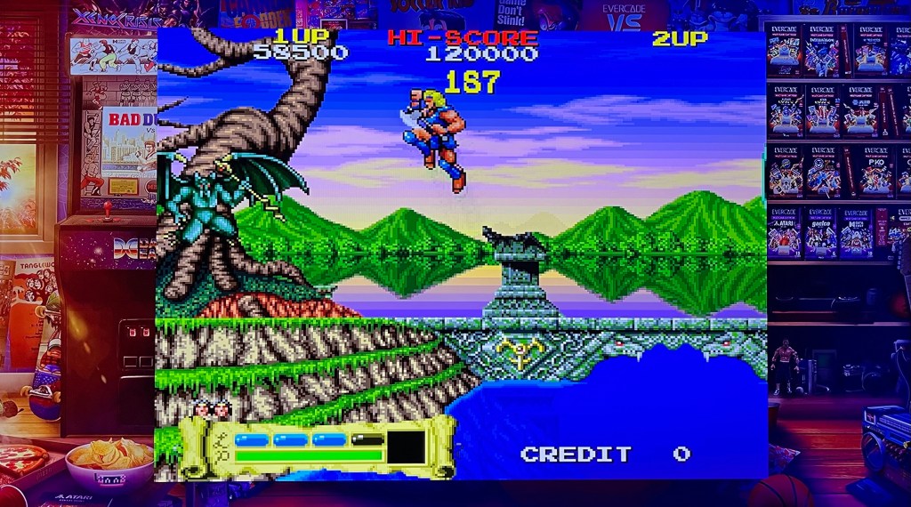 The Astyanax had better be the best game ever after all of that! Obviously it’s not, but we can play two players at once again in this 1989 fantasy hack and slash platform adventure! That trademark Evercade description page comes into its own again here, as it informs us that The Astyanax is a rare example of the arcade and home console versions being totally different from each other. Where this arcade version is totally inspired by Greek and Arabian mythology, the console one set you up as a school kid transported to another dimension! I think we’ll definitely stick with the arcade version here then, which has you cast as the warrior Roche with his legendary “Fire Axe” and thunder magic, and he’s on a divine mission to travel to the Castle of Algerine and defeat the demon overload Argos (rather than Argos the shop, though you never know…). Your legendary axe charges when you’re not using it, which is easier said than done given the enemy density, and your thunder magic is limited in use but is mighty potent, so keep an eye out for all of those collectibles!