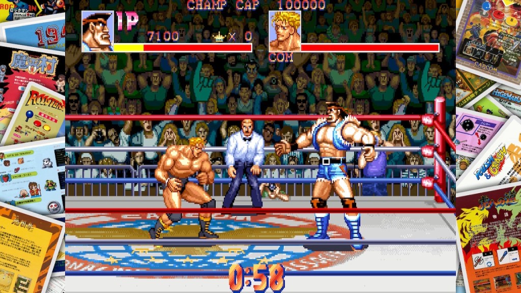 Last week I promised I’d go wild and splash some cash on something proper for the new Capcom Arcade 2nd Stadium rather than go on about pack-ins and freebies again, so this week I’m proud to present Saturday Night Slam Masters! Just to recap that discussion, because of the big crossover with Capcom Fighting Collection, I decided to pick and choose what to buy instead of getting the lot bundled, and after some very enjoyable research on every game available, I came up with a list of one. This! As much as it looks like an arcade wrestling game, it actually plays more like a one-on-one fighting game in a wrestling skin. It’s fantastic either way though! Simple jump, grab and attack controls mask loads of depth, especially with eight wrestlers (and a couple of extras) on offer, each with their own non-grapple special and finishing move. There’s a solo single match series mode and team battle royale, which is one or two player two-on-two, and to win either its about depleting energy for the pin or submission, or there’s also a count out, which can be a cheap way to win if you’re struggling! I’ve only really dabbled with all the characters so far, but it’s loads of fun already and will be hanging around here for a while yet!