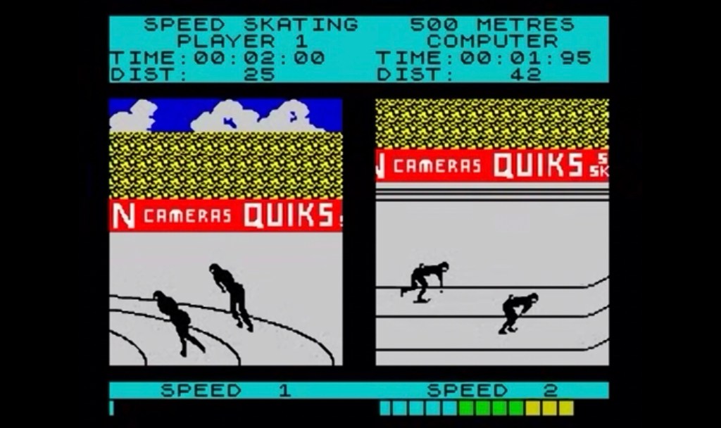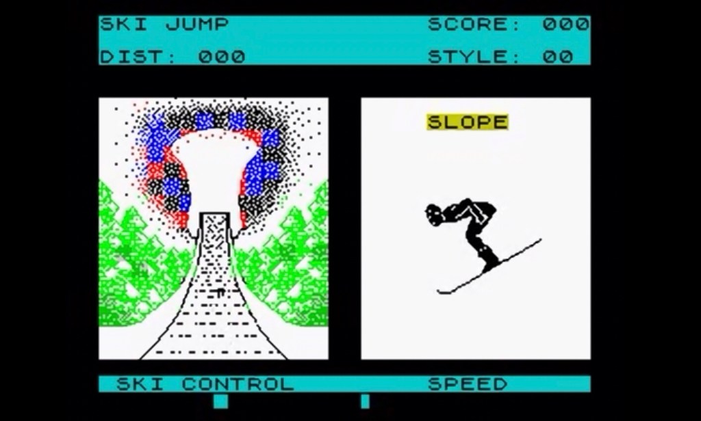 Speed Skating is another event offering two player action, and if you’re going to play it that’s probably the way because the computer opponent is a bit pathetic! It’s another split-screen affair too, with one side from behind and one from the side, and that means you’re not only waggling the joystick left and right for speed, but also up and down for position, a bit like Iron Man in that Combat School we mentioned earlier. You can choose from five different distances, all the way up to 10,000m, but why you’d put yourself through that agony I don’t know! The animation is nice from both viewpoints, but it really plods along – skate any slower and you’ll tip over. The minimal sound is particularly grating too! For all of that, I quite like it though – the added dimension really gives it an added dimension!