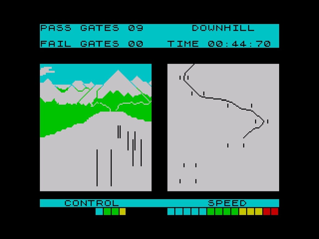 Unlike Winter Games, the events here are very much presented as eight separate mini-games, with no over-arching competition. The title screen is barebones to say the least, apart from the terrifying sampled speech saying “Winter Sports by Software Images” coming at you out of the silence if you don’t press the key for one of the eight (not seven) numbered events quickly enough! There is a high score table here too, which you’ll be needing for any longevity. Once you decide what you’re playing, the event loads and you get a sub menu; in the case of the three skiing events, they all load together, but bizarrely they’re now in a different order to the screen you’ve selected one of them from. Not a big deal I guess, but if it’s 1. Downhill on the title screen then why would it be 1. Slalom on the sub-menu? Once you’ve picked your control method, you’re good to go, so let’s have a look at each event in turn… Once I’ve decided if Downhill should come before Slalom!