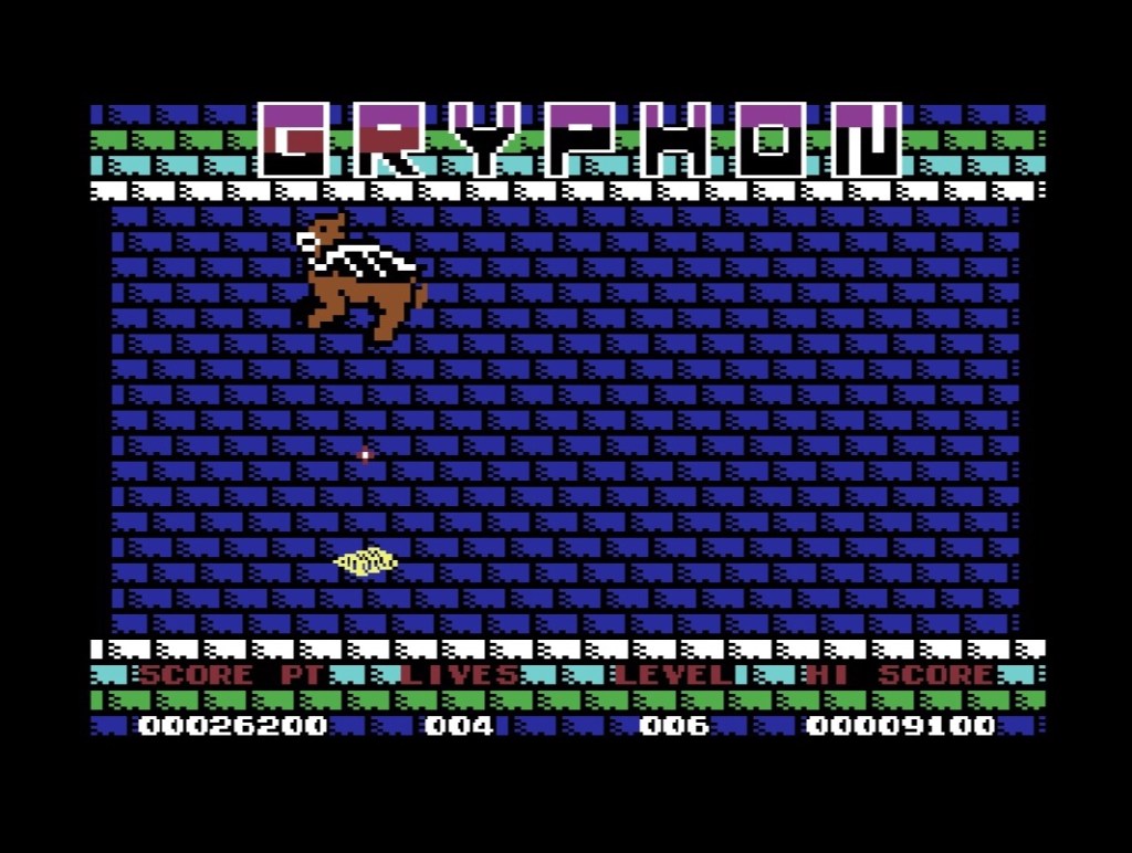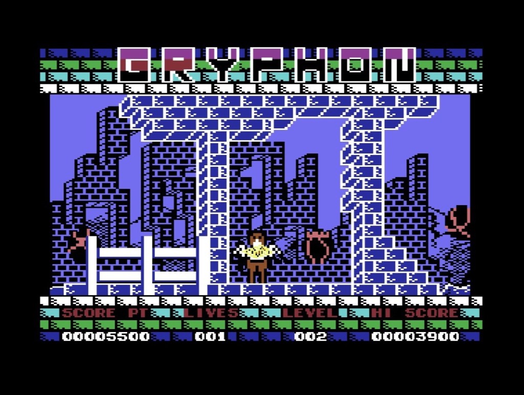 Wonderful stuff, but I know you’re only here for Gryphon, so let’s do it! Gryphon comes from the prolific hand of Tony Crowther, who I definitely remember for 1983’s Blagger and its sequel, Son of Blagger, but the first game of his I think I ever played was Wanted: Monty Mole when he was working for Gremlin Graphics, and that would also go on to become a favourite series of mine over on the ZX Spectrum! 1985’s Gryphon is based on the mythological gryphon or griffon or griffin, a legendary creature dating back to both Ancient Egypt and Persia with the body of a lion and the head and wings of an eagle, often known for guarding treasures and building nests lined with gold nuggets. And gold is where the game picks up, along with a dash of Alice in Wonderland, in “a world separated from our reality by a twist, a step and a dream. Here are the mystical woods, the surreal cities, and the infinitely dangerous darklands. And it’s a dangerous dreamspace, with poison lakes, strange barriers and “ID” monsters prowling.” You need to help your Gryphon escape these dangerous lands to a new home, and to do that you need to use gold bars to build bridges over the most difficult areas. Which is one of the most mystical aspects of the game when you think about it, considering it can fly, but anyway, on the left of each level are a six gold bars that you need to transport in your beak, one by one, all the way to the right of the level to lay out across the “most difficult” few feet water so you can cross to the next stage, of which there are three plus a bonus level between each one.