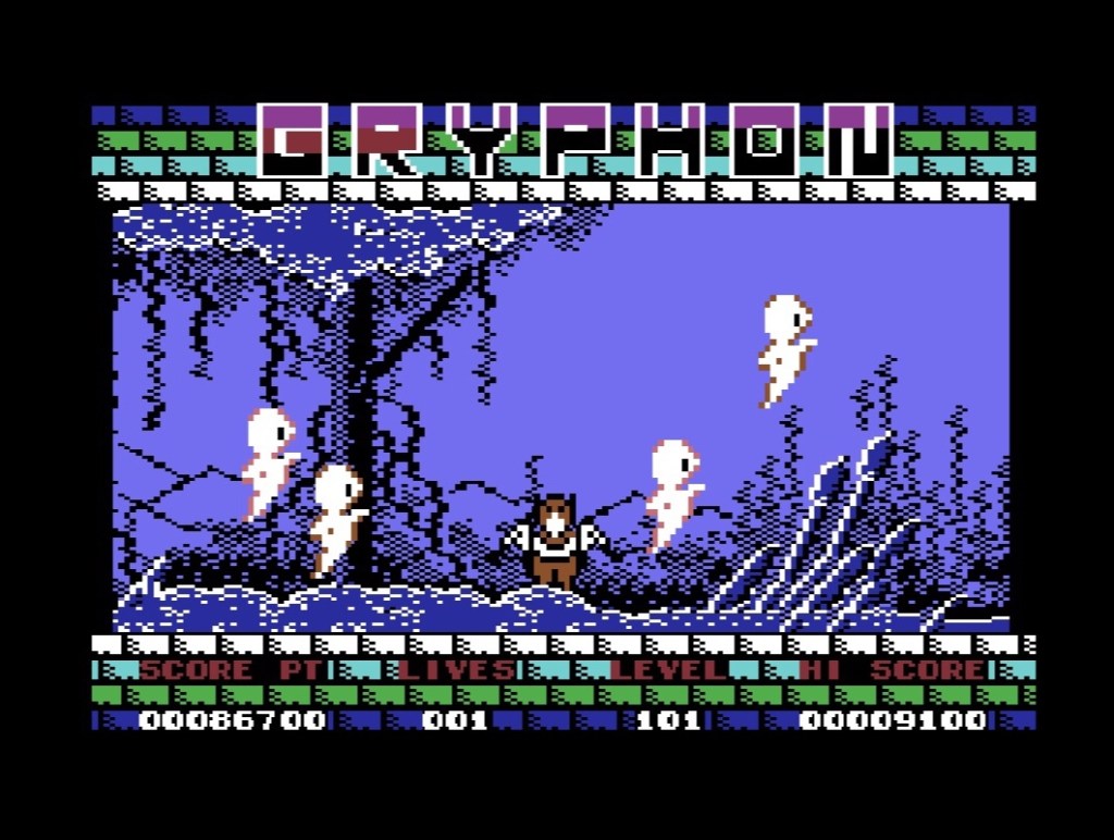 Before we leave the back of the box, the best description of a high score table I’ve ever seen! “A MEMORY OF SUCCESS… Write the name of your Gryphon in computer memory, along with its high score.” To help you achieve your high score, as well as moving bars from one end of the sideways scrolling map to the other, then going all the way back and doing it again, you can shoot magical bolts out of your mouth to take down the swarms of enemies you’ll encounter – a different type each time. And to help you do that, your Gryphon can, as we’ve established, fly… Kind of! Flying is a real ball-ache, where you need to start moving in either direction for a run up, which sounds reasonable except in reality it means you’re constantly wrenching the joystick diagonally upwards to ascend, then letting go to change height, which causes your creature to face outwards towards you and float down rather than facing any action so it can shoot at it, and then when you’re at the desired height it’s left and right controls to maintain that level and allow you to either dodge or fire. I’d love to say it’s simpler than it sounds, but it really isn’t, so be ready to give your poor joystick hand a workout!