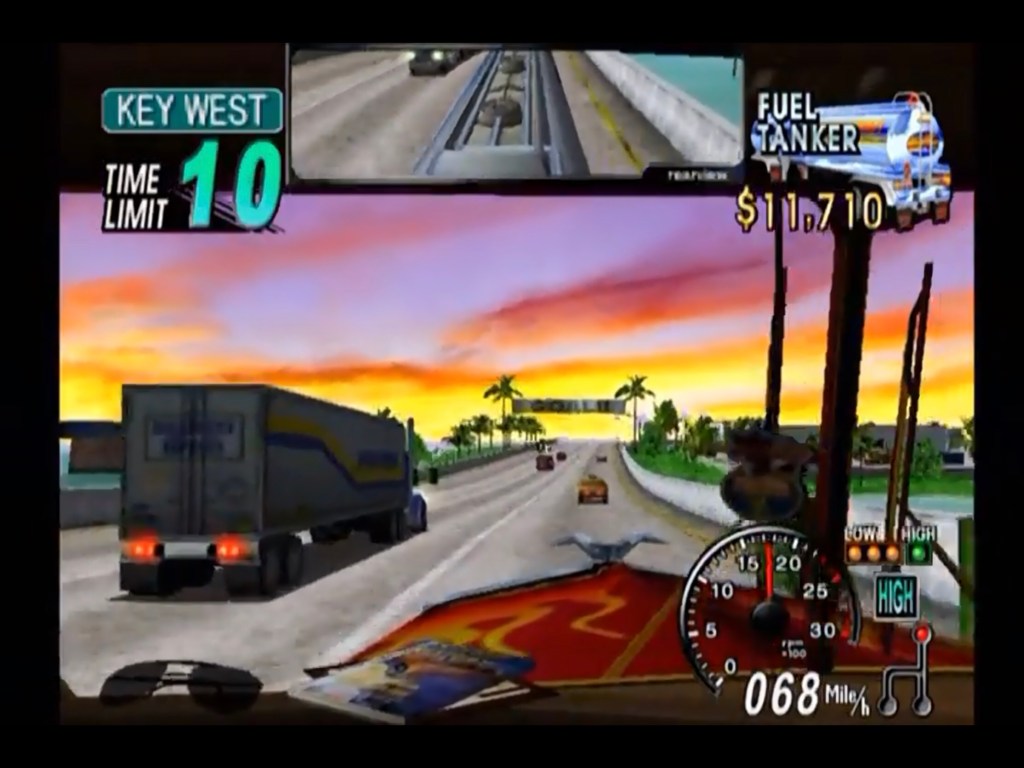 Closing out my new PS2 hoard, an arcade port from 2001, 18 Wheeler: American Pro Trucker. It’s a cross-country, multi-stage race against the clock (and your big-mouthed rival trucker) to deliver your load through all kinds of terrains and traffic conditions. Not to mention some crazy weather too! There’s a choice of characters that all play differently, and after the first stage you can also choose your load, with more unwieldy ones offering more cash, but this thing takes no prisoners even with the time-bonus vans to collide with! I know a truck racer is an acquired taste, but this is a really good-looking one, especially the in-cabin view, and what it lacks in acceleration it more than makes up for in variety. Really nice find!