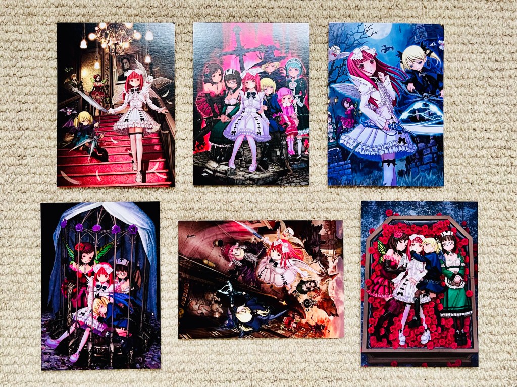 Six artwork postcards emerge from the box now, and while every single one does feature what the menu has now confirmed as mostly sexualised, mostly underage girls, they’re relatively tasteful considering, and actually, there’s some cool backgrounds and those reds and blues are really popping when you lay them all out together. Doubt they’ll ever leave the box but you need to keep something in there to have a rummage around in every once in a while!
