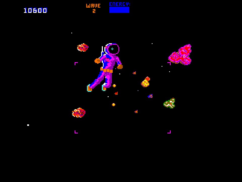 Blaster. From timeless to downright bonkers now, and the 1983 “sequel” to Robotron: 2084, where everything is now 3D, on rails and, apart from the nonsensical story that tells us it’s now 2085 and the Robotrons have destroyed the human race, has absolutely nothing to do with its supposed predecessor. Doesn’t stop it being utterly brilliant though! I loved this game from the first time I played it, with its diverse stages that have you flying through magic arches and avoiding giant robots, then rescuing marooned astronauts, negotiating time tunnels, avoiding stuff and shooting even more stuff until you finally reach Paradise, 20 million light years away. Or just plain old level 20! Nothing especially fancy about any of it, but it’s got a kind of Jeff Minter whackiness about it, all perfectly reflected in some great oversized particle effects and impressive early sprite scaling – you just can’t beat the neon-suited spacemen helplessly drifting out of a disco asteroid belt! Looks great here too, and it’s addictive gameplay loop is perfectly at home. I’d have genuinely bought this compilation just for this game, which maybe makes up for the next…