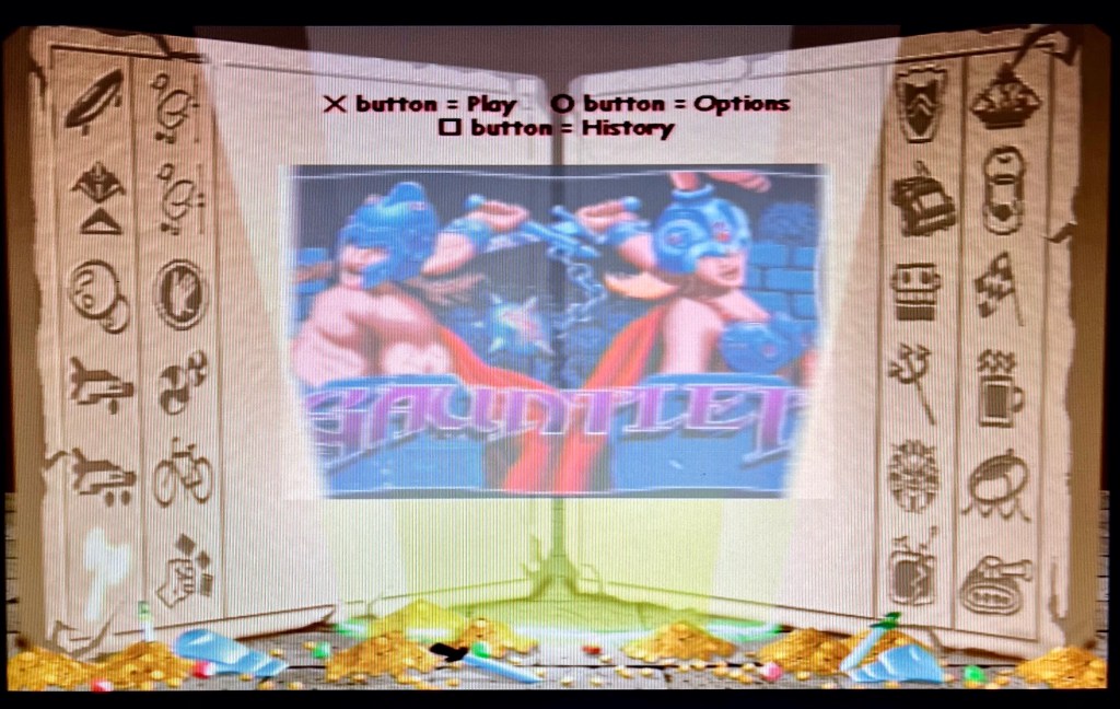 First one first though. And anyway, we’ve got Taito Legends 2 next in line to properly discover before we start messing around with any other sequels! Midway Arcade Treasures has what you might call “unique” presentation. When you load it up, you’re whisked into what quickly turns out to be an Ancient Egyptian pyramid, then around its very ornate corridors and chambers until you come upon two stone tablets with two columns of hieroglyphs down either side and some piles of gold coins, swords and unidentifiable pulsating silver things on the floor along the bottom. There’s also a very sinister pulsating, two-note drone going on that sounds like it’s been pulled right out of the Lakeside Amusement Park in Silent Hill. Not sure what that’s got to do with treasures, but I guess I see where the rest is coming from, as cheesy as it is! The hieroglyphics are how you select the games, and I’ve never liked this! Move your cursor over each, and the magical but very faded-out screen in the middle will bring up the attract mode for each one, thereby revealing its title. Sooner or later. Or you could just learn the pictures – axe is for Gauntlet, bike is for Paperboy, fist is for Rampage and so one. Ridiculous, and I really hope the sequels just give me the names to choose from when we get to them, rather than obscure symbols parodying a language that hasn’t been used since the 5th century A.D!