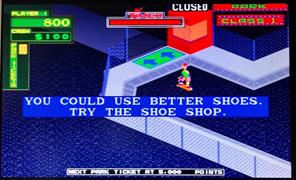 720°. Ironically, the first thing you notice about this game is that being stretched means the skateboard on the title screen is a more realistic shape than the slightly stubby original! Unlike other less official ways of playing, the PS2’s analog stick absolutely nails the controls too, which is quite the thing in a game as hard as this one! The city is a giant skate park, and riding and jumping around its surfaces earns you points to enter four proper skate parks – jump, ramp (half-pipe), slalom and downhill – as well as buy upgrades to boards and the rest of your gear. As intuitive as it is, this groundbreaking isometric 3D skateboarder from 1986 doesn’t pull any punches… Thank goodness you’re not putting real money in here! Give it time though, and there’s huge depth to not only mastering these disciplines, but also earning your way around Skate City, and both avoiding and taking advantage of its many hazards. Fantastic music, though it definitely sounded better coming out of the boombox-styled speakers on the original cabinet! You can keep your dated Tony Hawk and Skate stuff because this one is timeless, widescreen or not! And what a start!