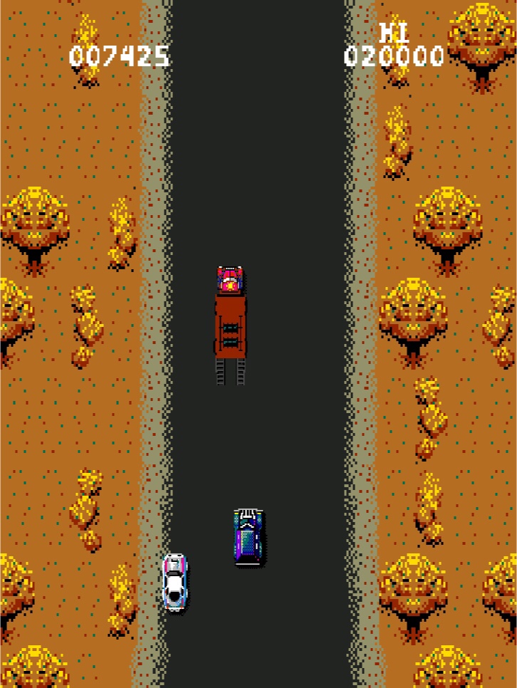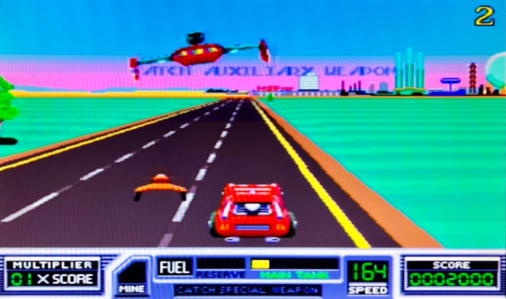 SpyHunter. Right, now I’m in a suitably bad mood to talk about this one from 1983! In theory, this top-down, vertically scrolling James Bond-inspired car chase is right near the top of my favourites on this here compilation, but there’s a “but” coming. And not just one of them! Firstly though, you’re a spy who was originally planned to be James Bond but that didn’t work out, and you’re driving your armoured sports car through various environments either shooting or bashing tooled-up enemy vehicles while protecting innocent motorists out minding their own business. There’s weapons lorries that occasionally turn up and drop a ramp down so you can drive in without stopping, and I genuinely think is one of the coolest things in any game ever, and they’ll provide missiles, smoke-screens and the like. Sometimes you’ll need to switch to a speedboat too, and take the chase to the waterways! Now, I’ve played the original arcade machine with the fancy steering wheel setup, but not as much as both the C64 and ZX Spectrum ports that managed all of the above on a single-buttoned joystick. Forward to accelerate, back to brake, fire to shoot and so on. The PS2 version has other ideas though… Gas on the right analog stick. Nothing else, just up on it to go faster. So what happens when you need to change gear on one of the buttons on the right? Well, you let go of accelerate and slow down as a result while you’re doing it. What’s a bit of unplanned deceleration while you’re surrounded by a load of bladed wheels though? And then there’s the fire and smoke-screen buttons all the way up on the shoulder buttons… A literal stretch to use those! And speaking of stretching… None of this is the way I want anyone to see this masterpiece. I’m out!