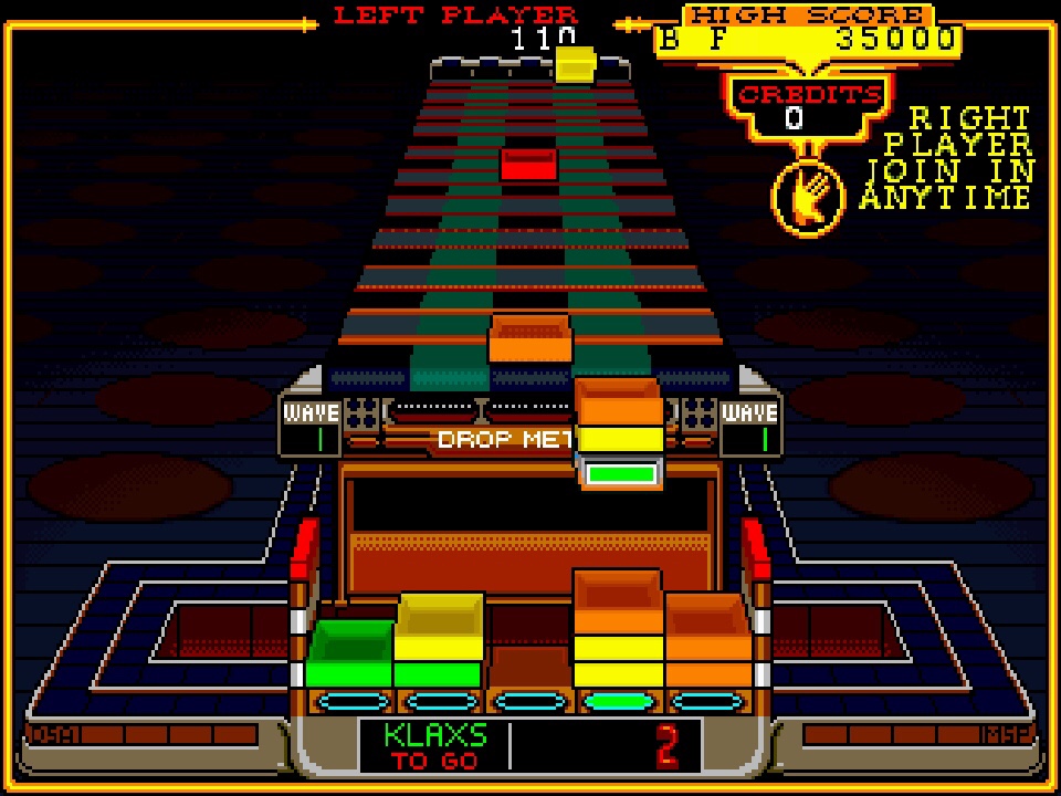Klax. This 1990 falling-block (kind of) puzzler came to Midway when they bought Atari Games a few years later; which is probably the case with other stuff here too, but I only thought about it when I got to this! Anyway, they were after an arcade sequel to Tetris, and this emerged out of AmigaBASIC, and as well as the arcade version (and excluding compilations like this one) I’m counting at least 23 home ports, which must be about the most of any game ever – even ended up being the Atari 2600’s last hoorah all the way into 1992! Actually, I know Klax best from one of those, on the Atari ST, where it’s even better than arcade-perfect because my colourblind eyes can actually distinguish between the yellow and green tiles on there! Those tiles are coming at you down a conveyor belt, and you have to flip them into the matching rows or columns or patterns specified for that level below your paddle to make them disappear before they reach the top. You can stack them to build up more complex patterns, and there’s risk-reward in doing this, but mostly it’s a joyfully frantic rush to survive for as long as you can! Colour confusion aside, everything is fine in this version and what I really enjoyed was how solid the tiles feel as you catch and drop them. Really excellent.
