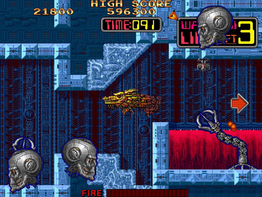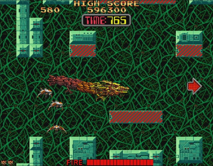 One thing’s for sure whether you’re playing mini cabinet or MAME though – you can never not be impressed by just how good your fresh, golden dragon looks at the start of every game! This is a real good-looker, and however random the backgrounds might be, it’s like every single one has been carefully crafted to perfectly set-off the dragon as the star of the show. The colouring everywhere is exquisite, and none more so than across the metallic scales and rivets, teeth, claws and minute details set into your high sci-fi fantasy craft as it glides and turns and coils around itself. The flames are really beautiful too, erupting from your suddenly parted fangs into this volcano of fire that triggers multiple explosions as it consumes your enemies, resulting in some spectacular effects way beyond their 1988 pedigree!