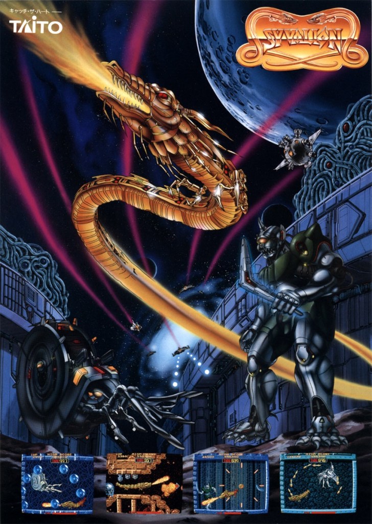 Right, we should turn our attention to SYvalion now. It’s Taito, it’s a Japan exclusive, it’s October 1988, and we have an arcade shooter of sorts from the hand of Fukio Mitsuji, also the creator of Bubble Bobble that we almost mentioned earlier. We definitely mentioned Darius earlier, and SYvalion is actually a spin-off of sorts from that series, and not only will you come across some folk from the planet Darius in this game’s storyline, but in 2009’s Dariusburst for the Playstation Portable, there’s a boss called Dark Helios, and when he changes form he’s the metal dragon we’re pushing about with our trackball right here! Anyway, the storyline here is presented as a series of scenarios, chosen at random at the start of the game, and they’re conveyed in Japanese-only diary entries, sadly for us, at the start of each stage, and apparently adapt to your performance so far, resulting in over a hundred possible endings. None of which I can understand, but I don’t suppose I’ll ever see many of them anyway! It all goes along the lines of aliens invading Earth and turning us into their robot slaves, and depending on the scenario, you’re going to either steal the SYvalion – a golden, fire-breathing dragon-shaped spaceship – then fight them, or you’ll respond to a distress signal instead. Then fight them! The story isn’t the only randomness at play here either – everything else is too! Each chapter or stage or level is a big maze, and you need to make your way through it, helped by some handy signposting, while also avoiding obstacles, breathing fire at enemies, until you hit its boss room at the end. And all of that is random, along with the music playing behind it.