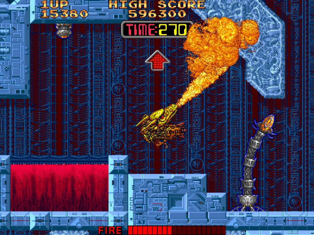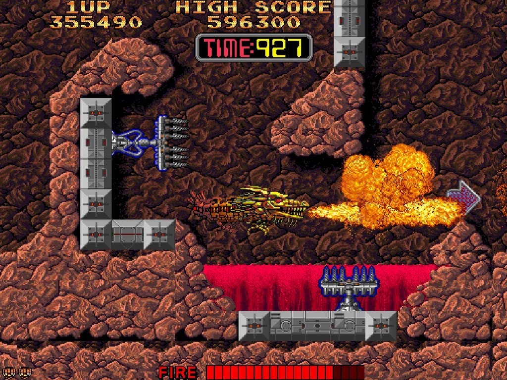 Once you’ve got the feel though, it feels great, and, as I discovered, switching back to a controller for both MAME and the SNES port, that suddenly becomes the alien concept for SYvalion! While nuanced movement takes a while to come, breathing fire is far more immediate, and immediately far more intuitive. It’s really cool as well! Hit the single button control and out it spews for as long as the cool-down meter at the bottom allows; if it runs out you need to take a break and let it replenish, fully or partially, and as we saw earlier, according to my primitive attempt at translation, moving about will make this happen a bit faster. While it’s going though, getting it where you want it is fantastic – imagine putting a tennis ball on a table, laying your palm on it and rolling it around… That’s exactly how you direct the fire here, and it works brilliantly, offering instant 360-degree destruction. It’s so good that every twin-stick shooter should have a trackball for the shooting from now on!