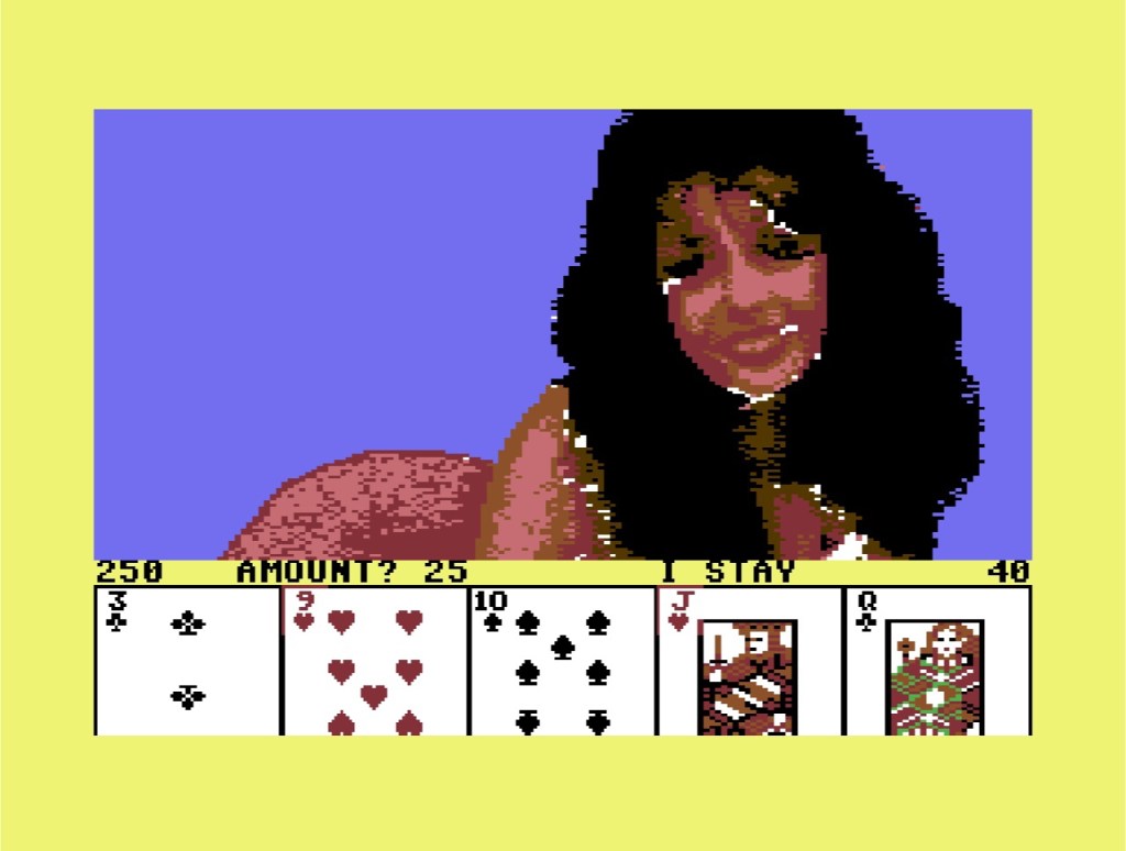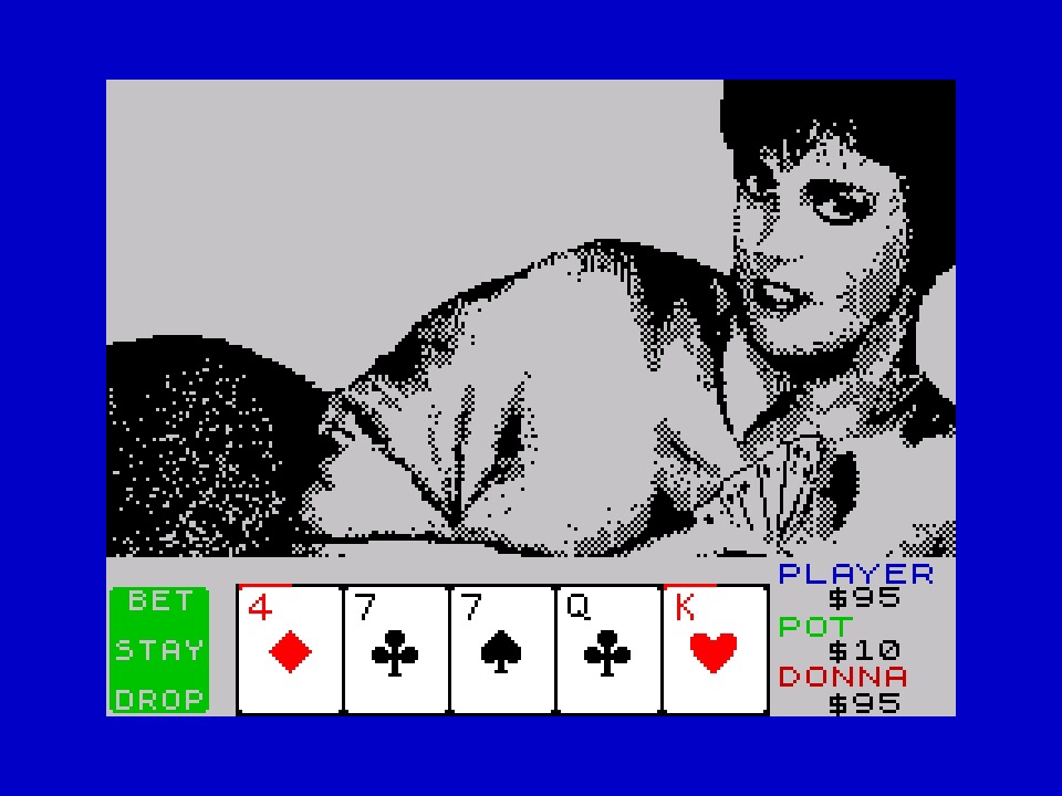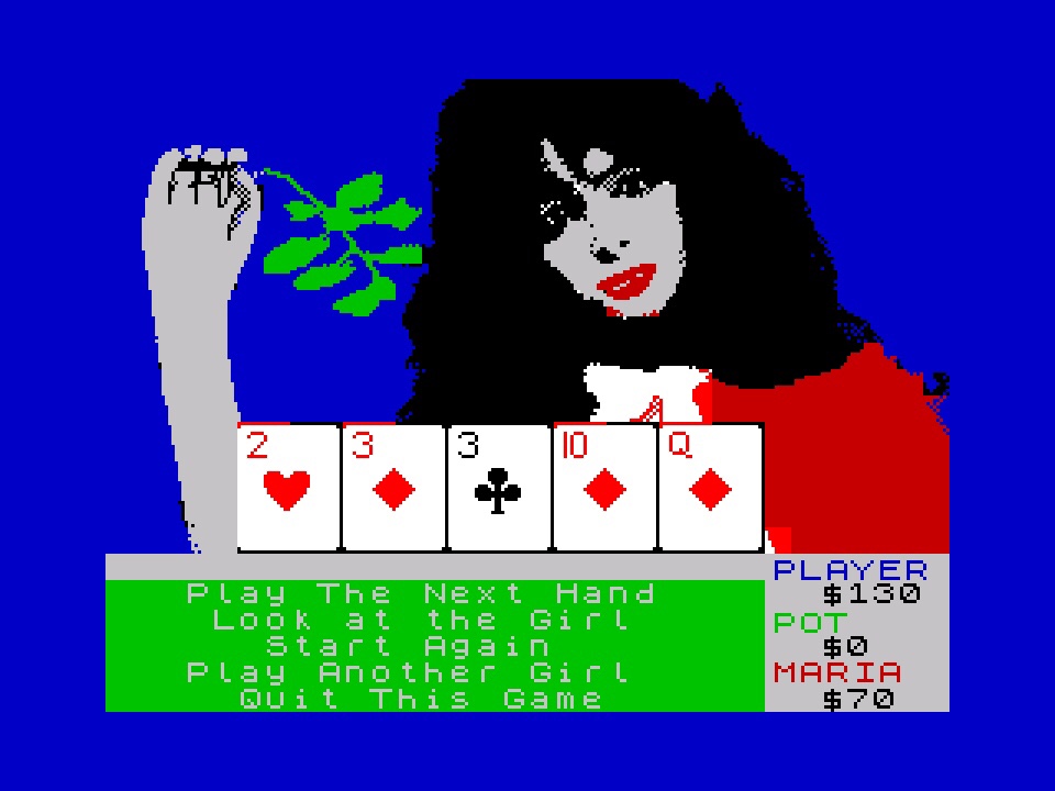Between hands, you’re given the option to just go ahead and play the next, or you can stop to get a full-screen “look at the girl” or just start all over again or quit altogether. There is an option to play another girl too, which involves finding where she is on your tape and loading her. Unfortunately I didn’t splash out on this pioneering piece of what would eventually evolve into DLC so I can’t tell you much about that! What I can tell you about though is that this seems to amount to a pretty solid game of poker, if you’re okay for everything to take its jolly old time to do anything! Of course there’s a compulsion to see the next state of undress, but what I assume is the basic compulsion behind playing poker for money also seems to be there, and as a result, once I kind of knew what I was doing, was pretty much hooked on playing this, and have been every time I’ve been back. Which is more times than I’m going to admit to here, so let’s just say I didn’t stop until I’d seen it all!