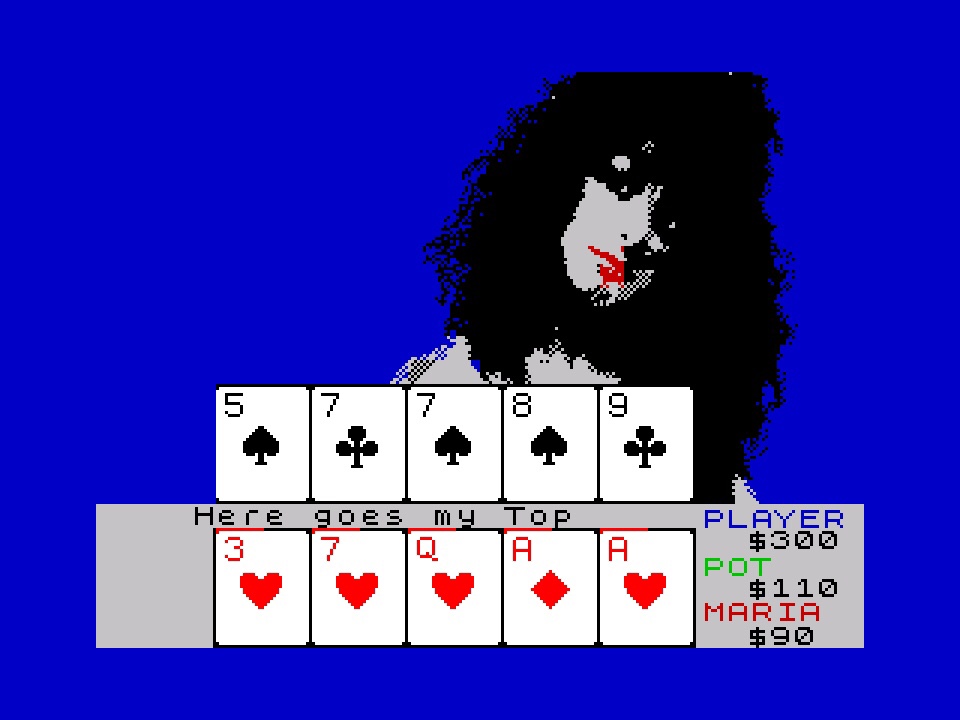We’re going to leave Suzi and Melissa (although other opponents were also available on expansion disks) and turn our attention back to Maria now. I don’t have the original Spectrum box to hand, but the back of the Atari ST box will probably do… “STRIP POKER has never had such a glamorous challenger. MARIA WHITTAKER invites you to take your seat, clean your screen and settle down to pit your wits and skill against her wiles and charm. Do not let her looks and guile fool you into making rash bets or you will lose all you stand in before you can say MARIA WHITTAKER. If you can keep your cool and take your chances boldly, your screen will sizzle as MARIA reveals the stunning charms and beauty that have made MARIA a household name and a dream girl of millions across the five continents. The turn of a card can make the dream come true.” And I refer you to the images you can see all over this page so you can make your own mind about that if you’re not playing the Atari ST version! By the way, credit to the wonderful Atari Mania for the box scan.