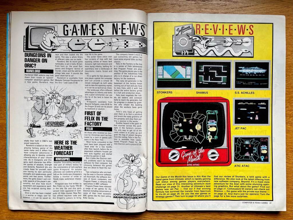 As we ran a bit long on a couple of those this week I think we’ll leave it there. Which is just as well because that’s all I’ve played! However, what I did also do was take my original collection of Computer & Video Games, which began in 1985, back a little bit further… These things are not 85p anymore, so I’m not going mad, but what I am now trying to do is extend backwards to 1984 (for starters!), and to that end I just picked up the February 1984 issue. These things are a joy to me, and when you’re presented with reviews of “new releases” like Atic Atac on ZX Spectrum or the outstanding Jetpac on the VIC-20, how can it not be? Also very timely was the arcade review of Elevator Action because I’m just finishing off a deep-dive into that which will appear here in a few weeks! Tons of type-ins in this issue too – and I do love a good type-in – as well as some really cool adverts for stuff like The Hobbit by Melbourne House for the Oric, 3D Space Wars from Hewson and the coming of the mighty Atari to your home computer. Great days!