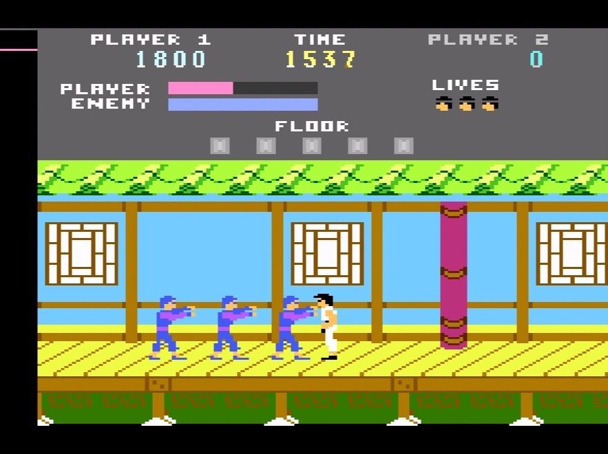 One game I did play a lot of was Kung-Fu Master, ironically in the café of the same leisure centre I was learning kung-fu in at the time of its 1984 release! First scrolling beat ‘em up? Arguably yes, but regardless you’re punching and kicking your way through an army of thugs, midgets and dragons in flowerpots to save your girlfriend at the top of the Game of Death-style building she’s being held in in. And what a great-looking building! Loads of detail in the backgrounds as well as the sprites, and some nice music too. Just plays a bit fast and floaty compared to the original, but as ports go (keeping in mind one of the worst ever on the ZX Spectrum for this) it’s not bad at all.