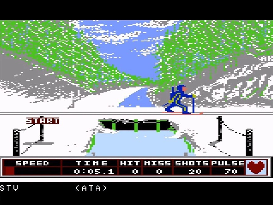 Last up in our little 7800 tour is Winter Games from 1987, which sits inside my top twenty games of all-time over on the Commodore 64 so I’m possibly going to be the hardest to please with this one! Actually, what’s there is pretty much perfect, but the problem is it’s not even close to being all there! Okay, maybe missing the two skating events isn’t such a bad thing, but we’ve lost the hotdog too, so that’s the best part of half of the events gone in total, and we’re just left with biathlon, ski jump, bobsled and speed skating, and it’s all over within five minutes. Not quite as atmospheric as the C64 version either but it’s good while it lasts.
