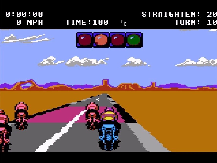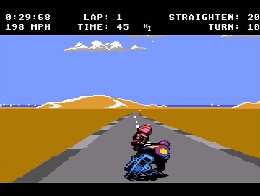 Aside from that accelerator button, you’ve got another button for jump but it seems like when you were busy customising that bike you completely forgot about brakes, so there are none. Instead, you push forward on the stick to shift to high gear and pull back to switch to low gear, which is your best bet for slowing down on sharp turns although it’s hit and miss (and mainly hit, as you might imagine) at best! There’s also some very convoluted “response controls” that affect the time it takes you to drop into a turn and straighten after it, and they’re obviously very important because they get their own display during races, for example, “STRAIGHTEN:22” and “TURN:10” alongside regular stuff like elapsed time, remaining time and gear indicator. Anyway, this mysterious response control thing is well hidden away behind the following… “1. Set the A/B switch next to the left controller port to B. B is the position to the right. The Control Parameters Table with default settings displays in place of the Score / High Scores box. 2. Use the right joystick to set response times. To set the Straighten response time, move the right control up or down until the desired number displays. (1 is the slowest response time, 25 is the fastest.) To set the Turn response time, move the right controller right or left until the desired number displays. (1 is the slowest response time, 12 is the fastest.) Straighten time is the length of time it takes your bike to return to an upright position after a turn. Turn response time is the length of time it takes your bike to lean into a turn. 3. Return the A/B switch to its original setting. The Control Parameters Table is replaced by the Score / High Scores box.” Phew! Guess it’s just a controller sensitivity setting, but if it’s all the same I’ll stick to elastic bands!